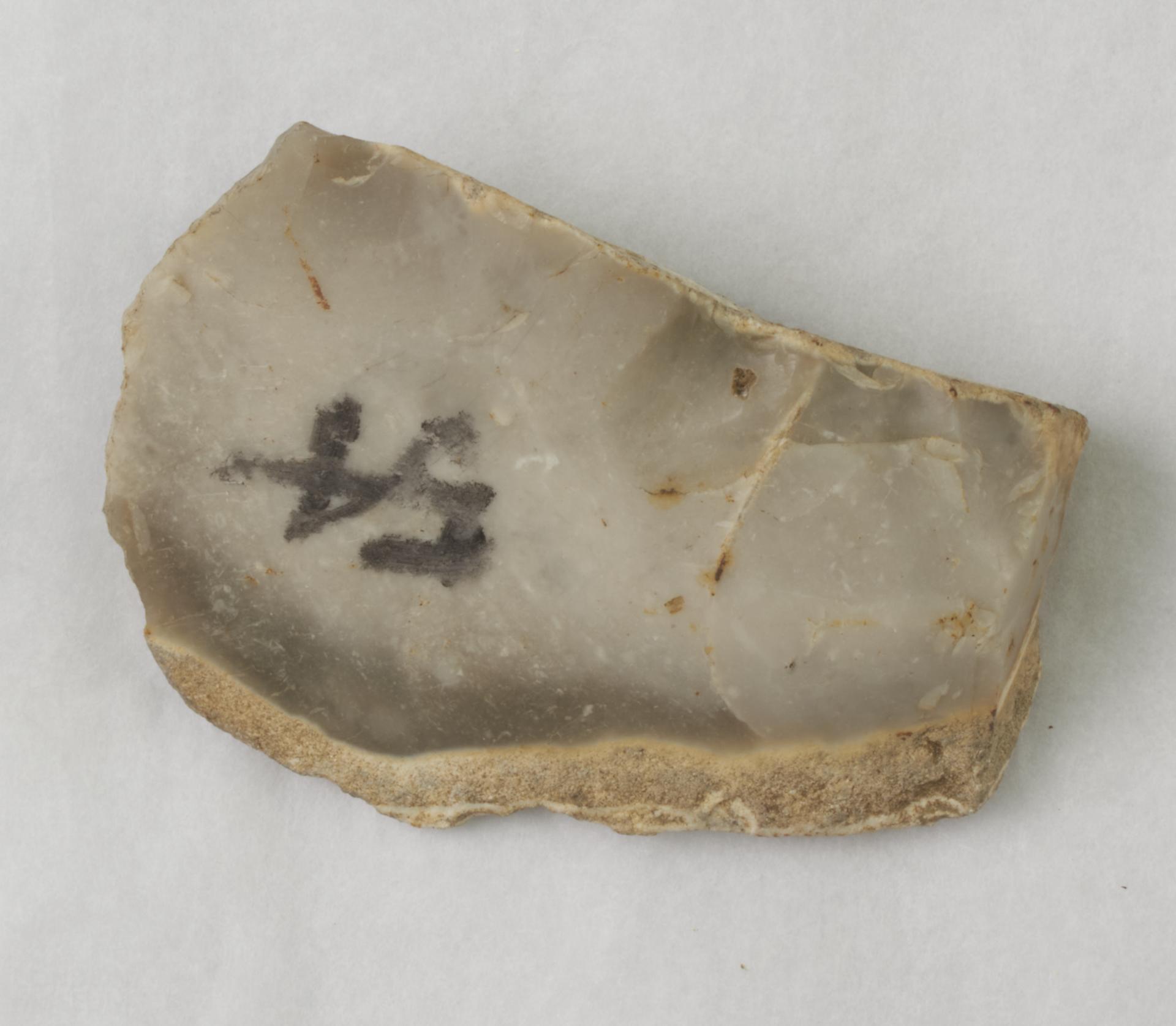 Flint scraper with white patination and some cortex. Large flat side narrowing to a thin edge that has been retouched. Possibly a side scraper. 54 marked on one side.