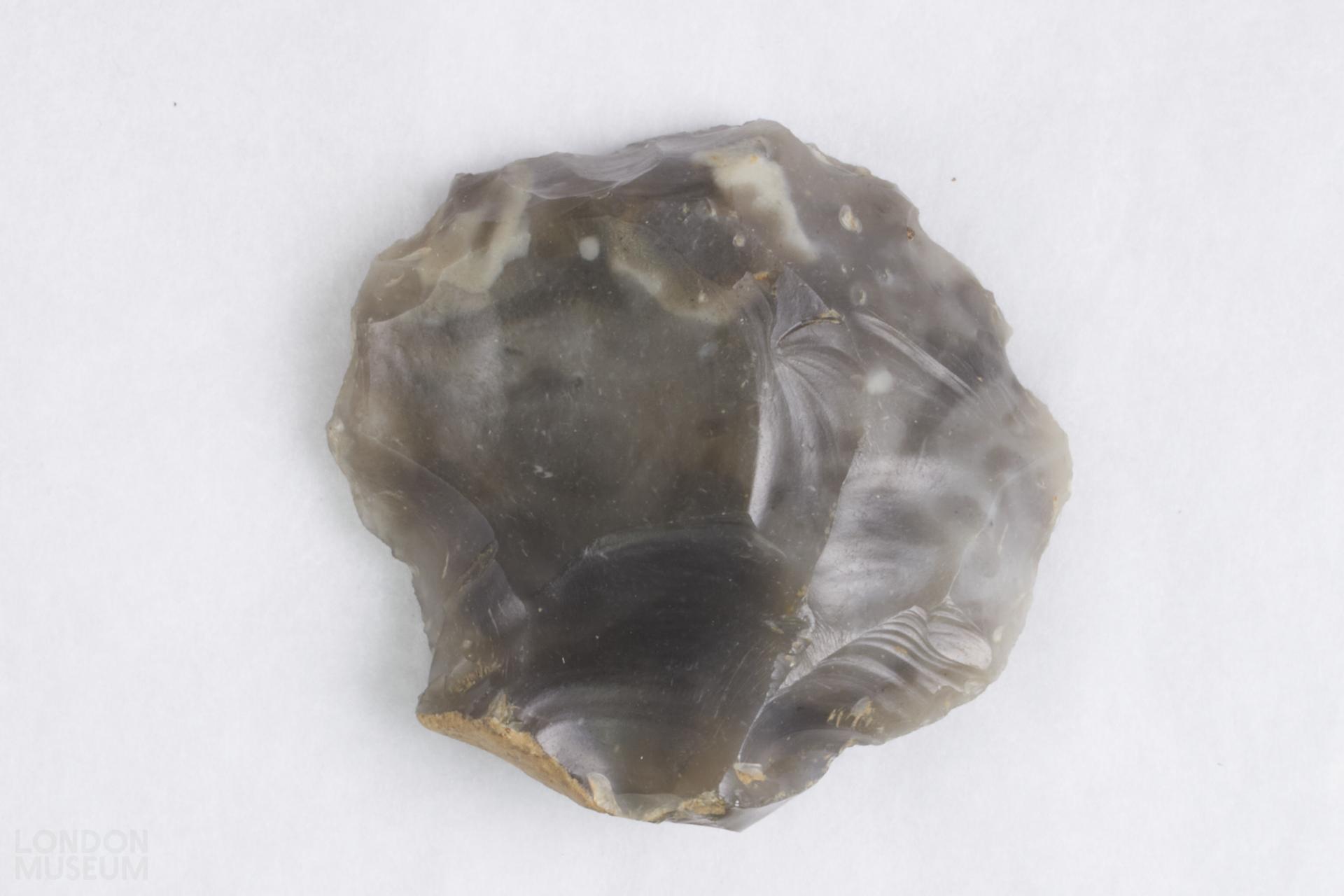 Flint scraper, dark grey and white, circular shape and irregular edges.