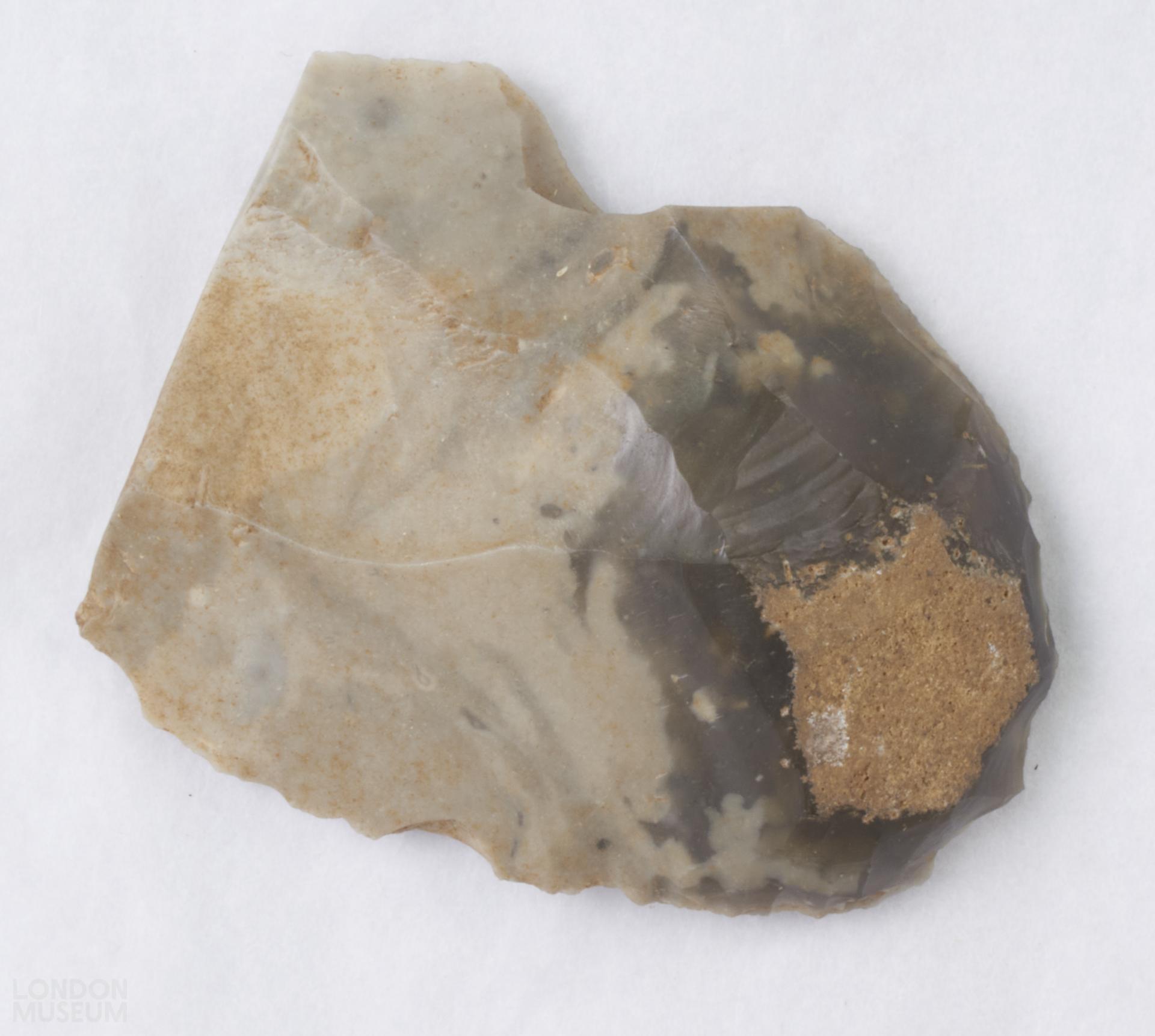 Flint scraper, light grey with darker patch on one side. Retouched on three edges, one edge flat. One ridged side.