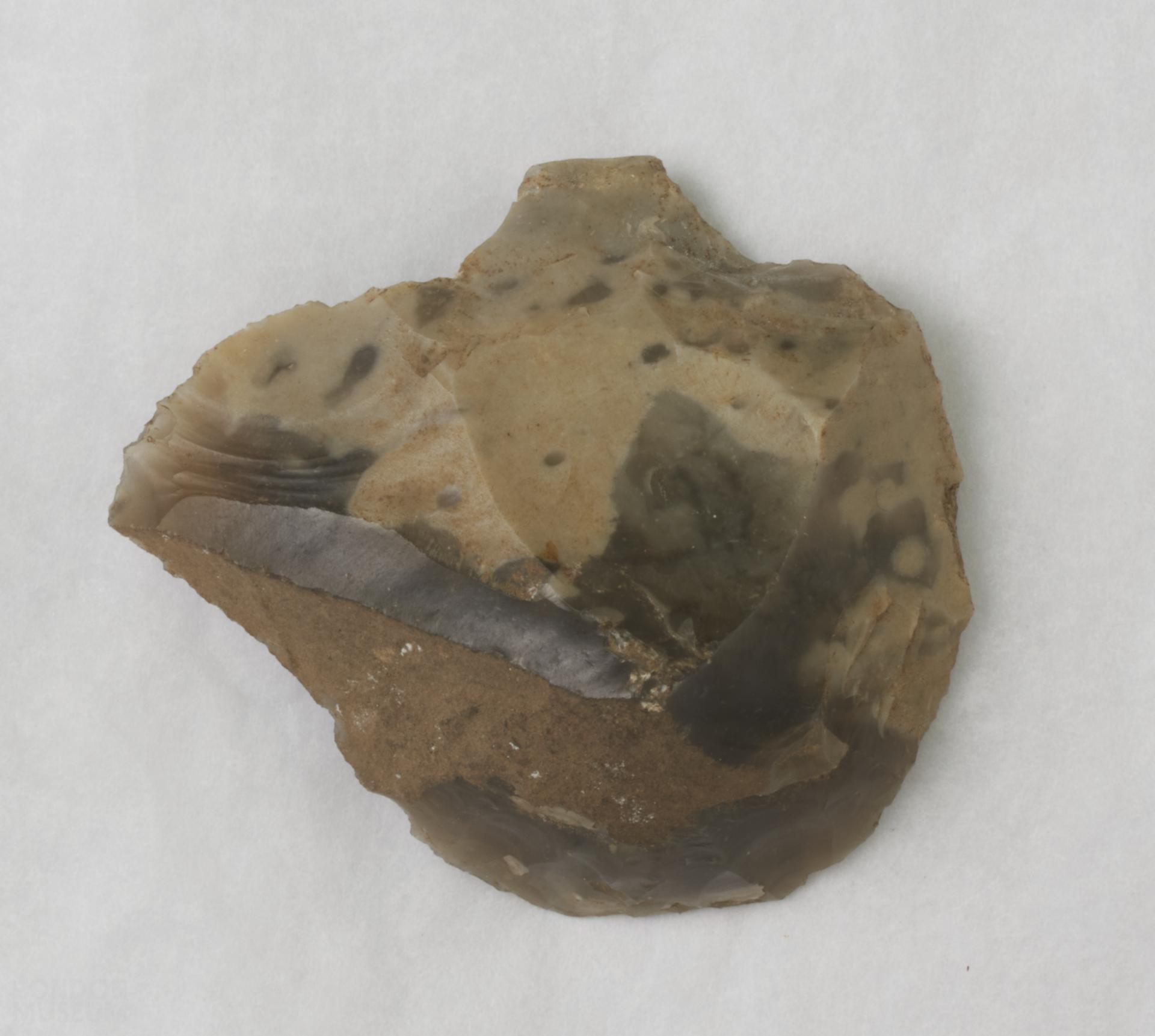 Flint side scraper. Irregular shape. One longer side has been retouched. Base is smooth. 51 marked on one side.