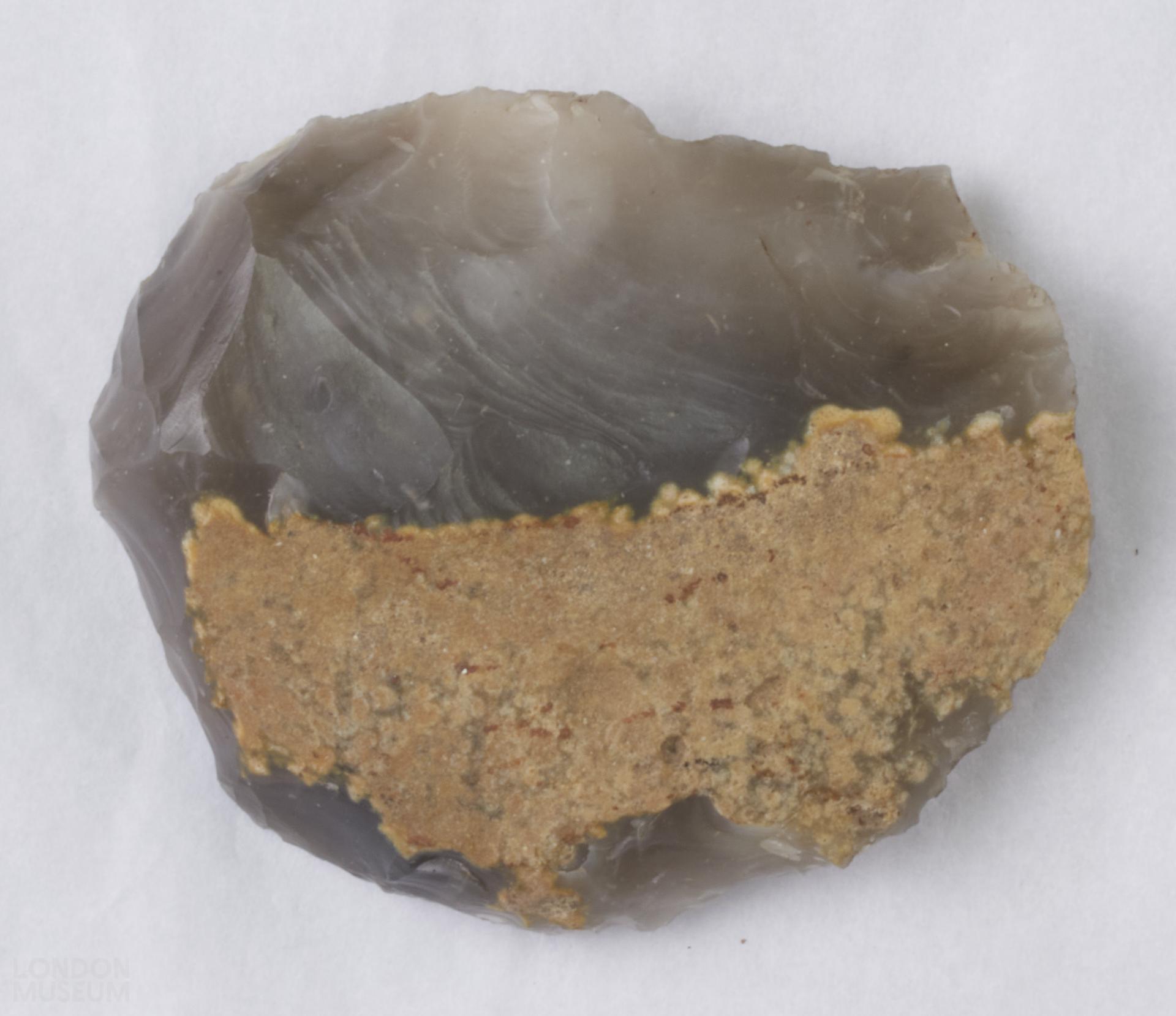 Flint scraper, grey colour. Disc shape, retouched on three sides.