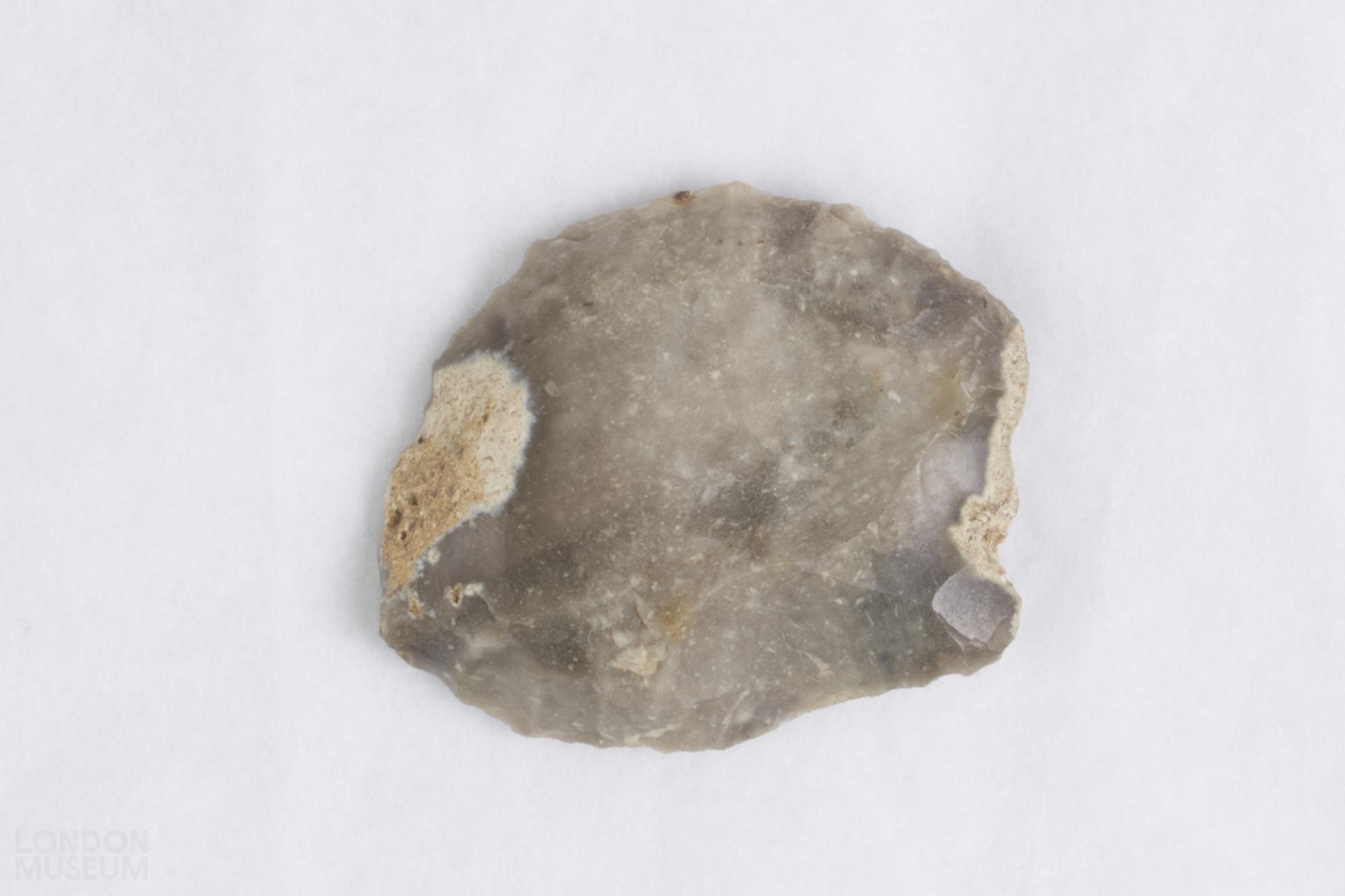 Flint scraper, grey, irregular shape.