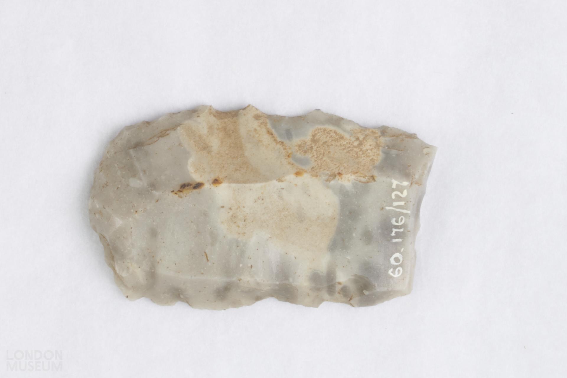 Flint scraper, grey color. Elongated shape with one ridged side and one flat edge.