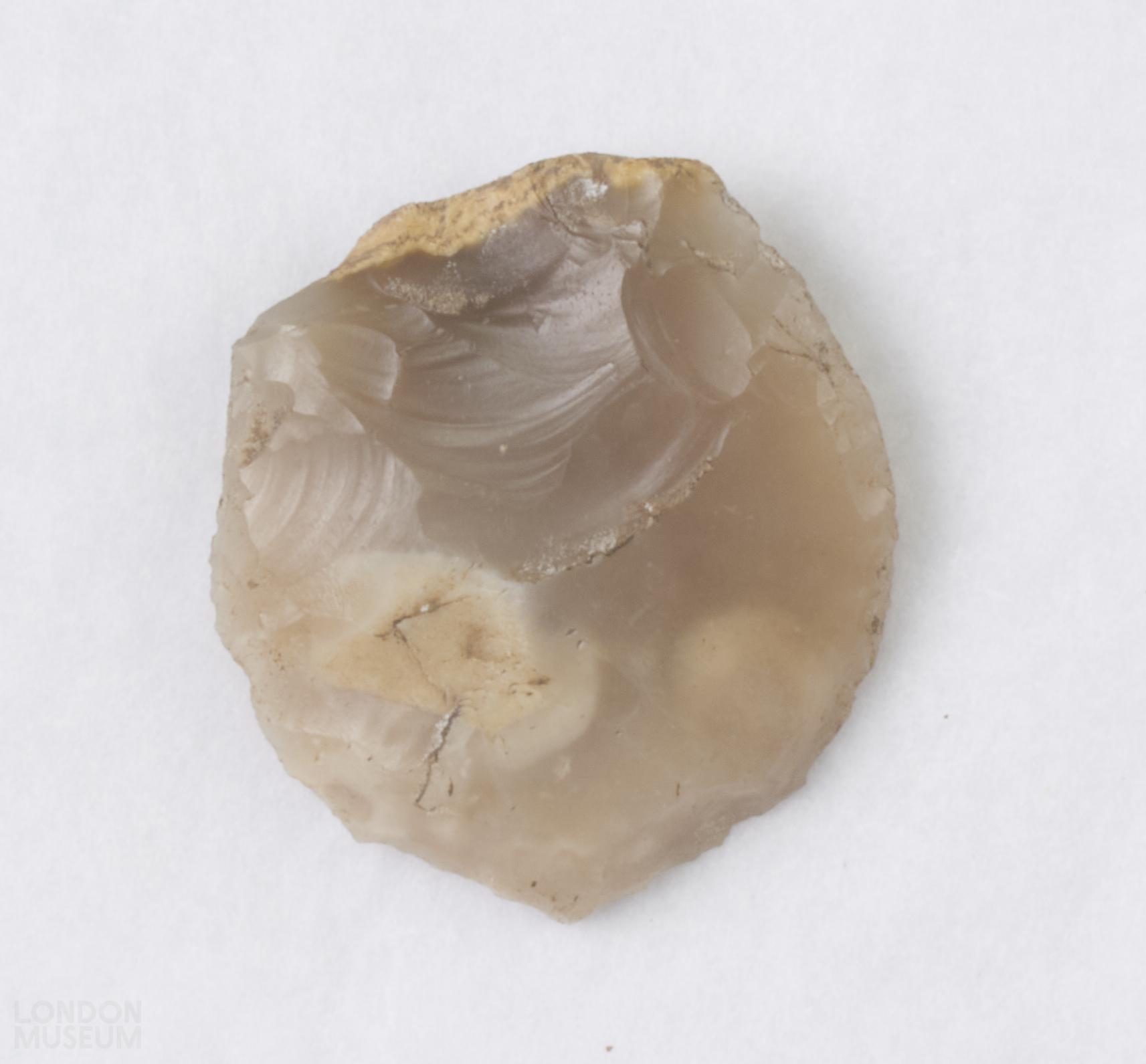 Flint scraper, discoid. Grey colour.
