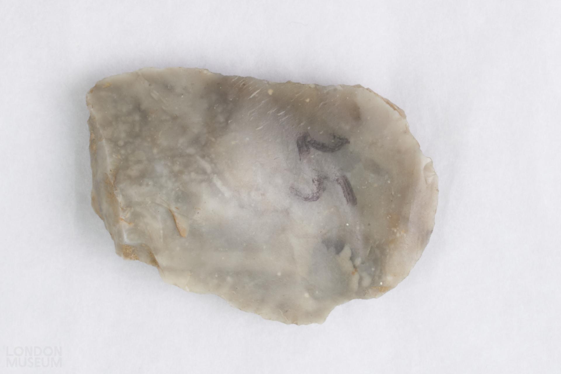 Flint scraper, grey, 3 retouched sides. Elongated shape.