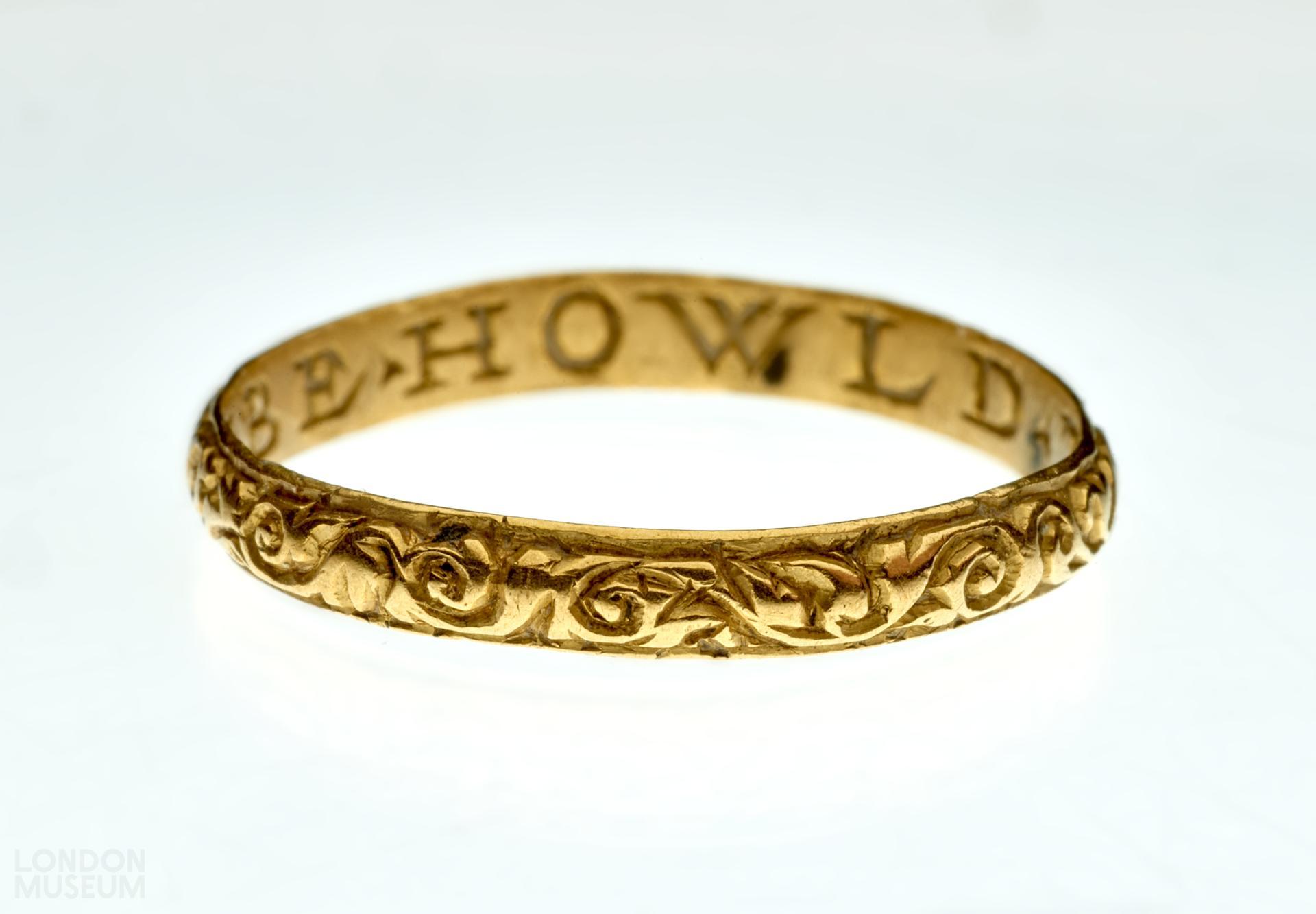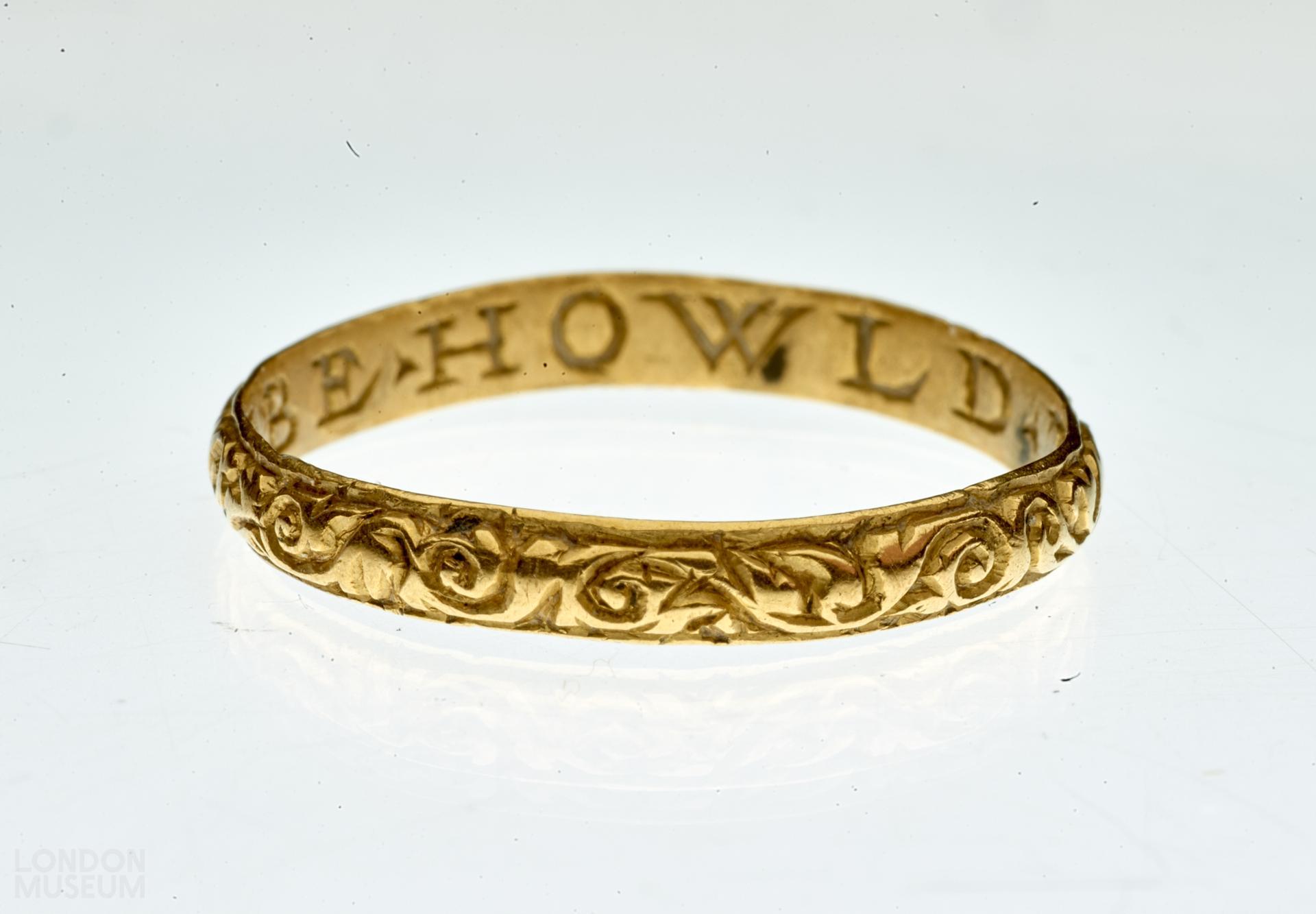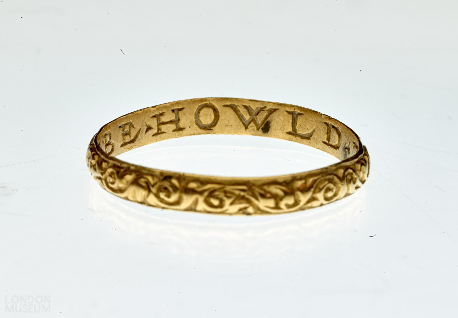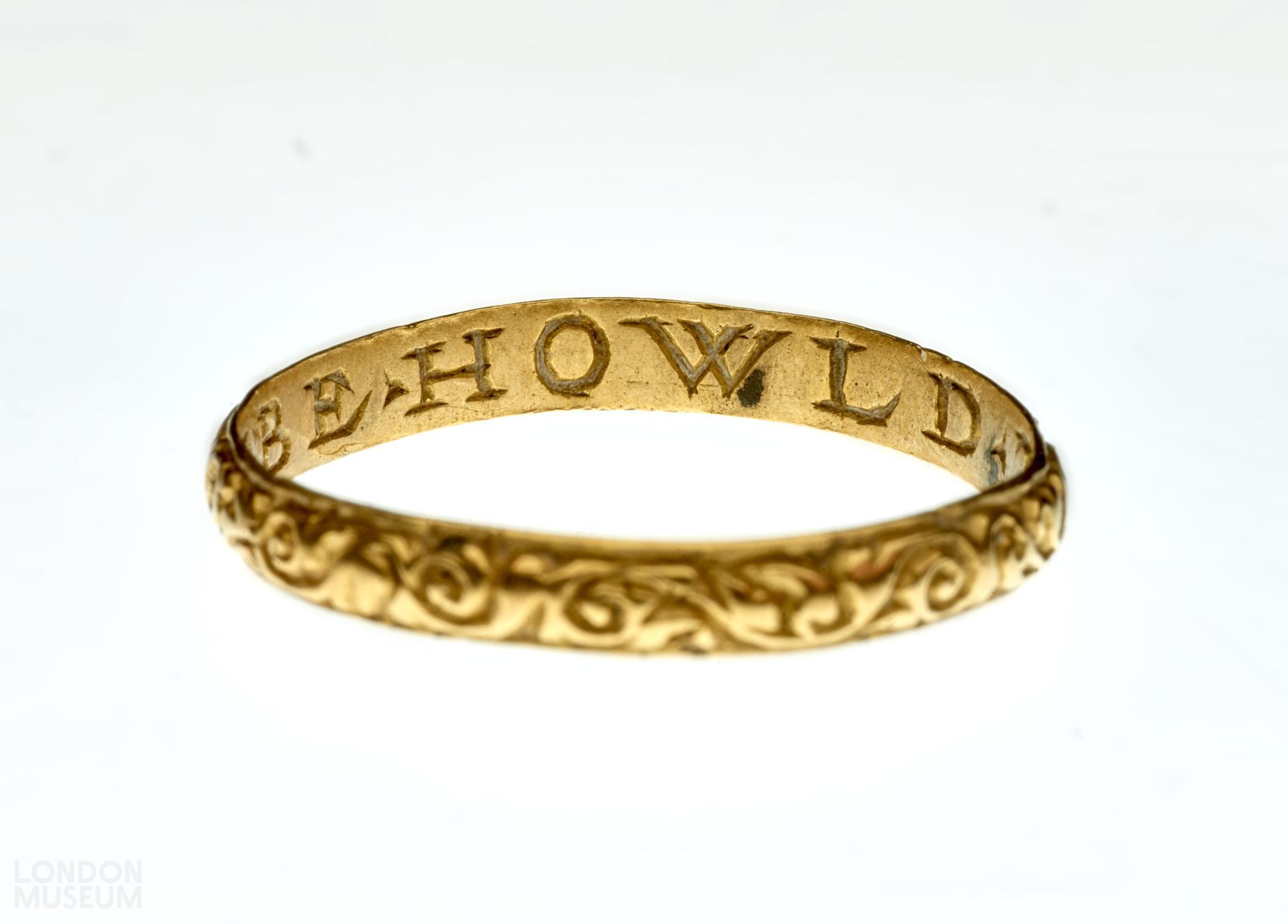 A gold posy ring with a D-sectioned hoop, decorated with vitruvian scrolls and inscribed internally in Roman capitals 'BE HOWLD THY END'. There are no marks. Jewels incorporating memorial devices and inscriptions were popularly used to remind the wearer of the fragility of human existence, the ultimate vanity of wealth and the transcience of life on earth. Skulls, coffins, skeletons and other symbols of mortality were often combined with memento mori inscriptions such as DYE TO LYVE or BEHOWLDE THY END to encourage the wearer to place their trust and hope in God and 'future life with Christ'. Death's head rings seem to have been particularly fashionable in England.