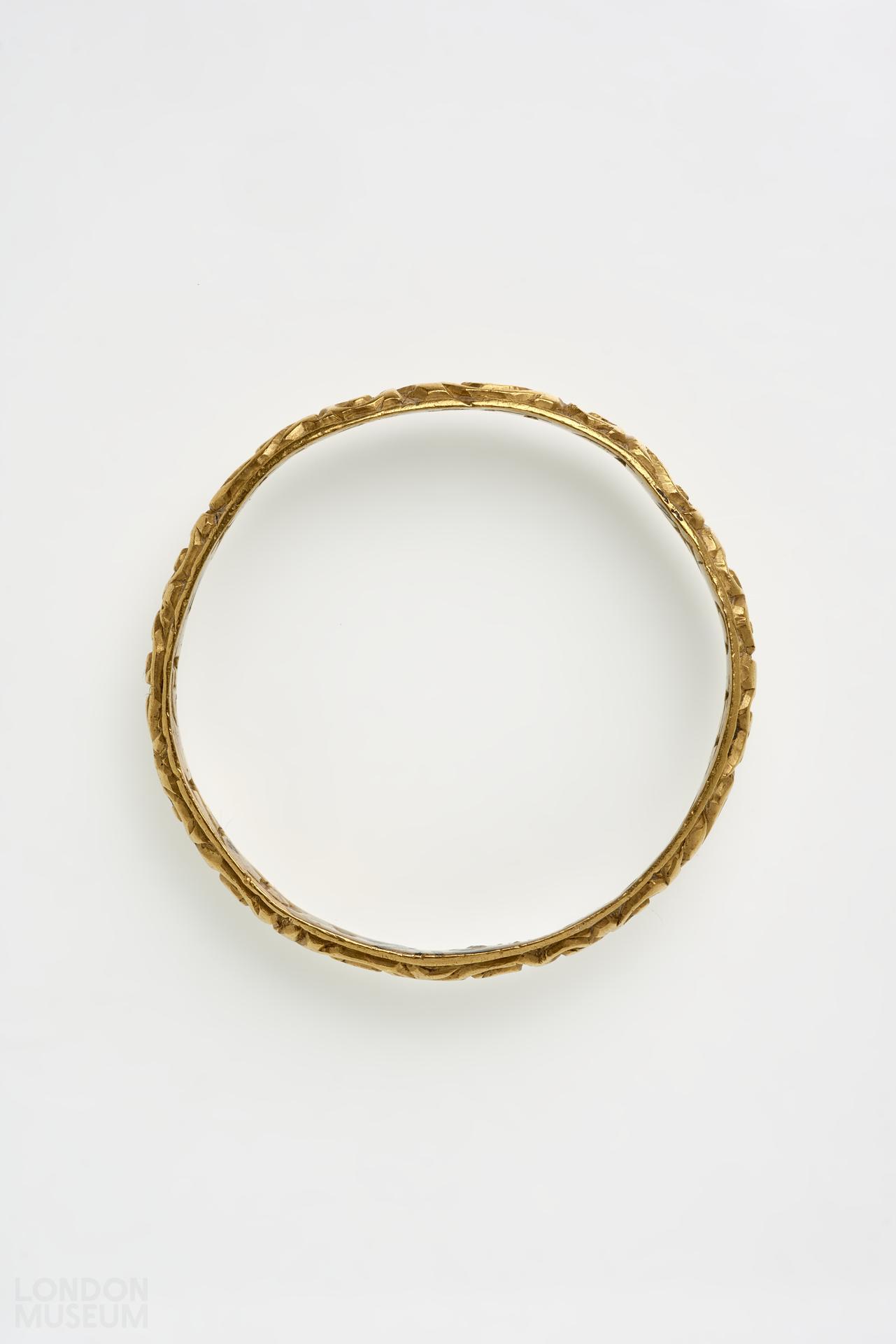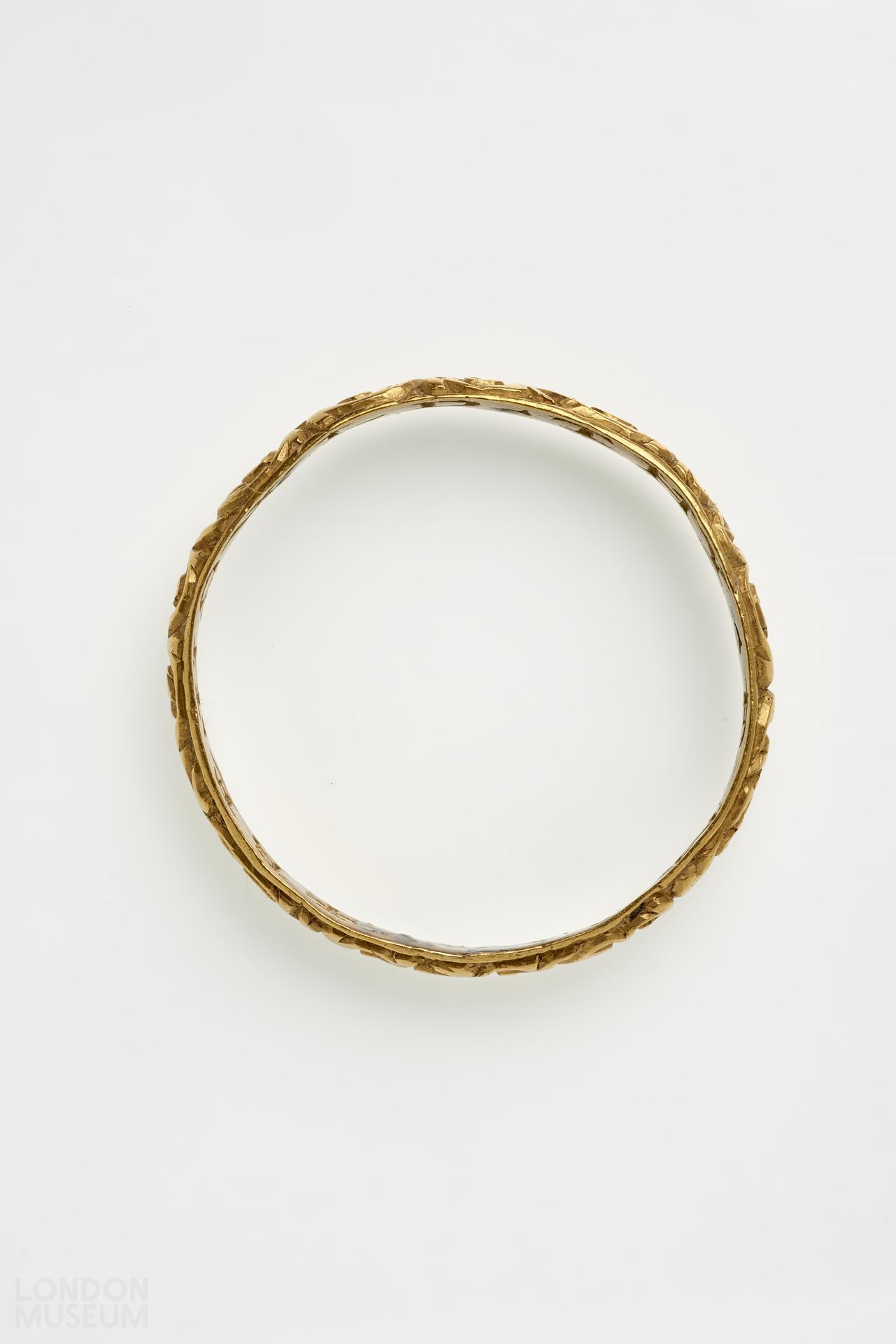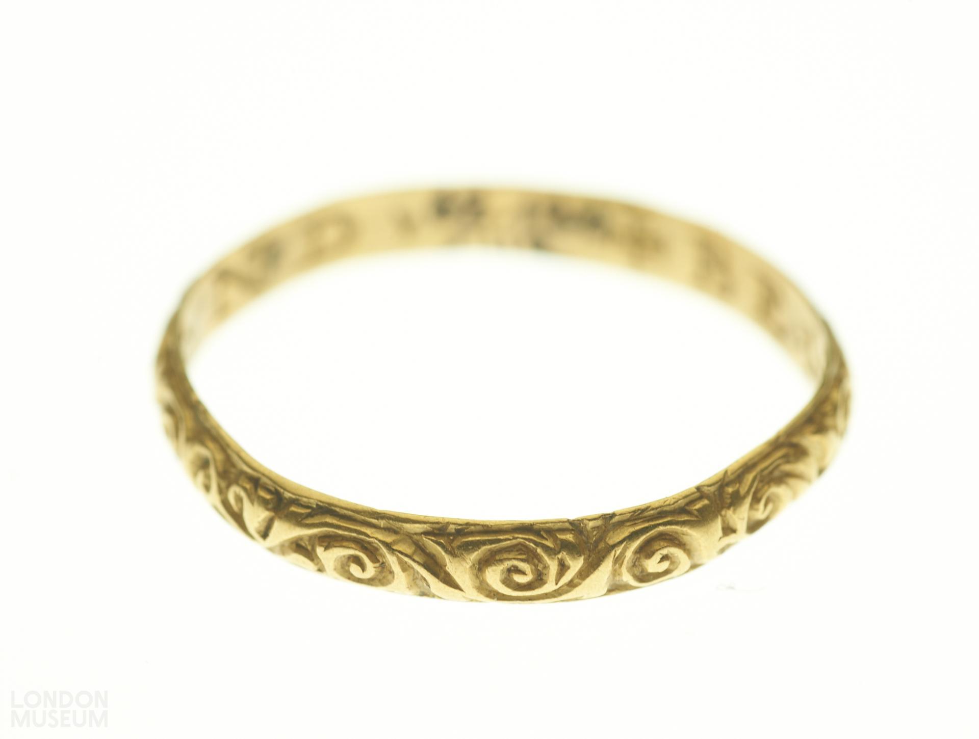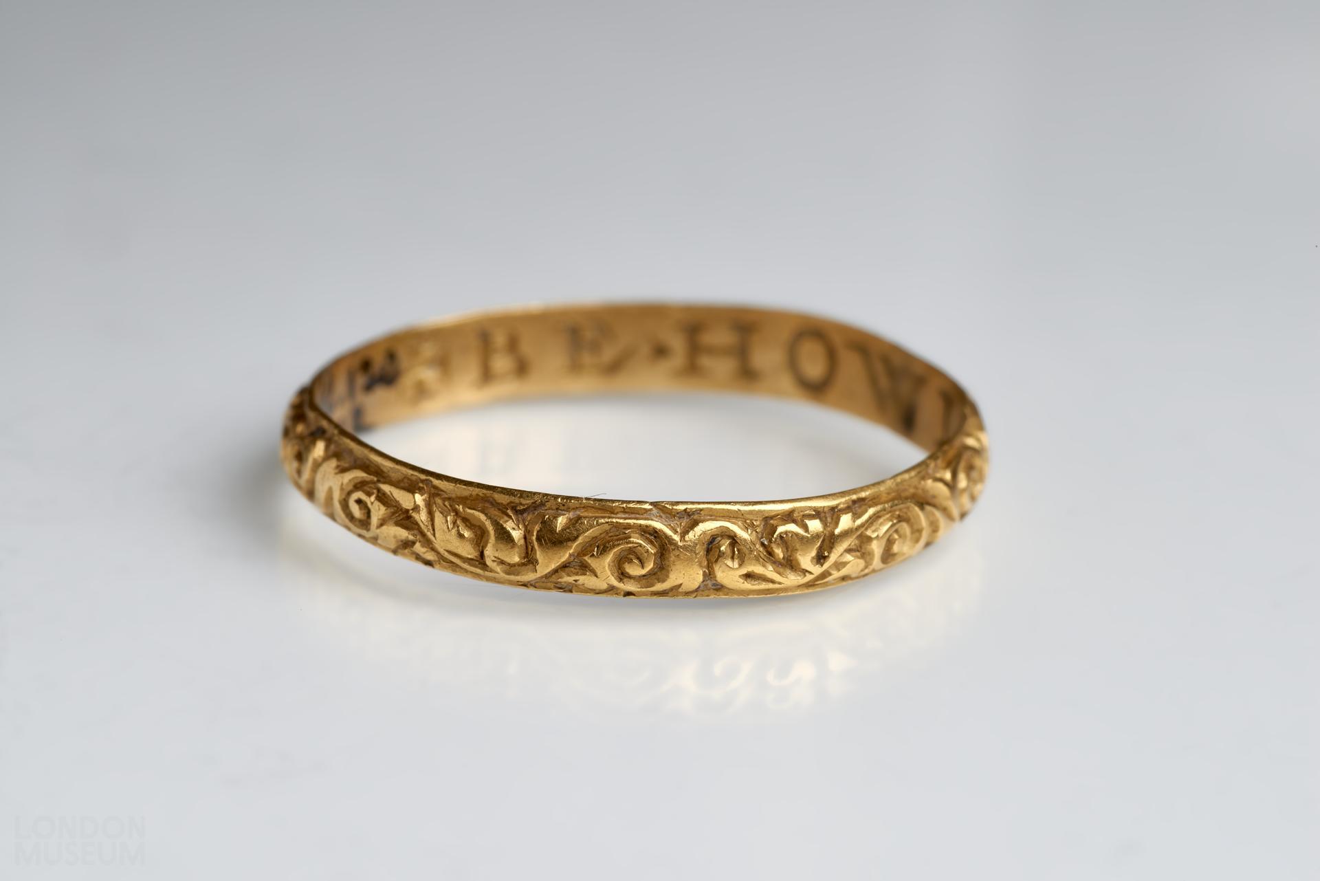 A gold posy ring with a D-sectioned hoop, decorated with vitruvian scrolls and inscribed internally in Roman capitals 'BE HOWLD THY END'. There are no marks. Jewels incorporating memorial devices and inscriptions were popularly used to remind the wearer of the fragility of human existence, the ultimate vanity of wealth and the transcience of life on earth. Skulls, coffins, skeletons and other symbols of mortality were often combined with memento mori inscriptions such as DYE TO LYVE or BEHOWLDE THY END to encourage the wearer to place their trust and hope in God and 'future life with Christ'. Death's head rings seem to have been particularly fashionable in England.