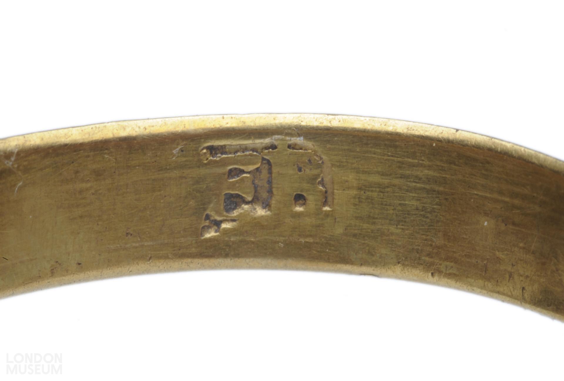 Gold mourning ring with a hoop of D-shaped section. Engraved externally with a skull. Inscribed internally in quasi-cursive "D M S ob 30 Jan '78" [1678] and maker's initials 'EB' (Roman capitals in a rectangular punch).