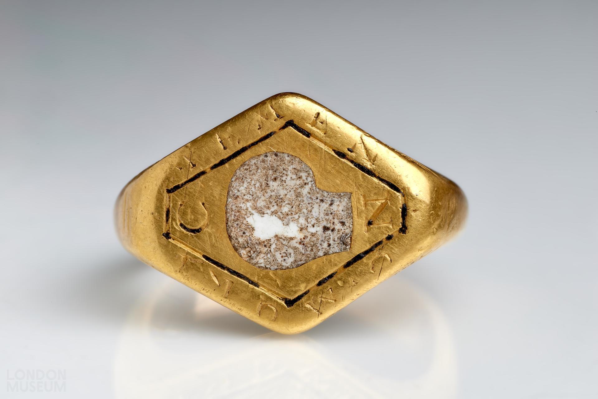 A gold memorial ring with a thick, D-shaped hoop. The lozenge shaped bezel bears a champleve white enamelled skull (now badly degraded) with 'C' above and 'N' below. Surrounding the black enamel lozenge border is a black inscription in Roman capitals: MEMEN[TO] MORI ['Remember you must die']. The edge of the bezel is embellished with engraved 'ropework'. There are no marks.This seventeenth century ring was evidently made to commemorate someone with the initials 'CN'. Rings of this type often included the date of death and, where appropriate, a coat of arms or personal signet. They were usually bequeathed in wills or distributed to friends and family at a funeral. Although many memorial rings were worn on the finger, some hung around the neck or from ribbons at the wrist and arm. A number of rings of similar type have survived; several with swivel bezels, bearing either the deceased's coat of arms or a merchant's mark which could be used in the manner of a signet.