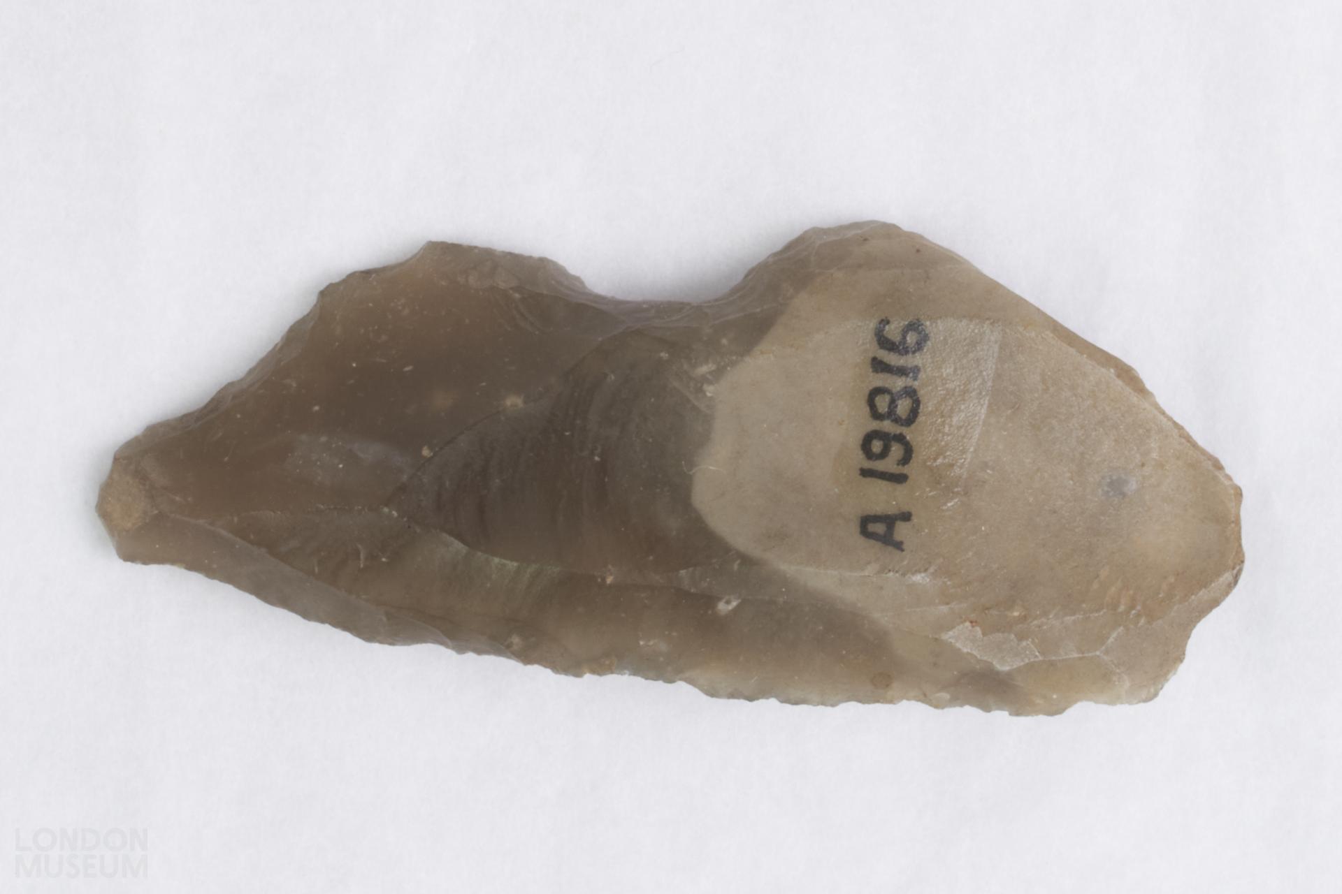 Flint hollow scraper, dark grey with lighter patches. Elongated shape.