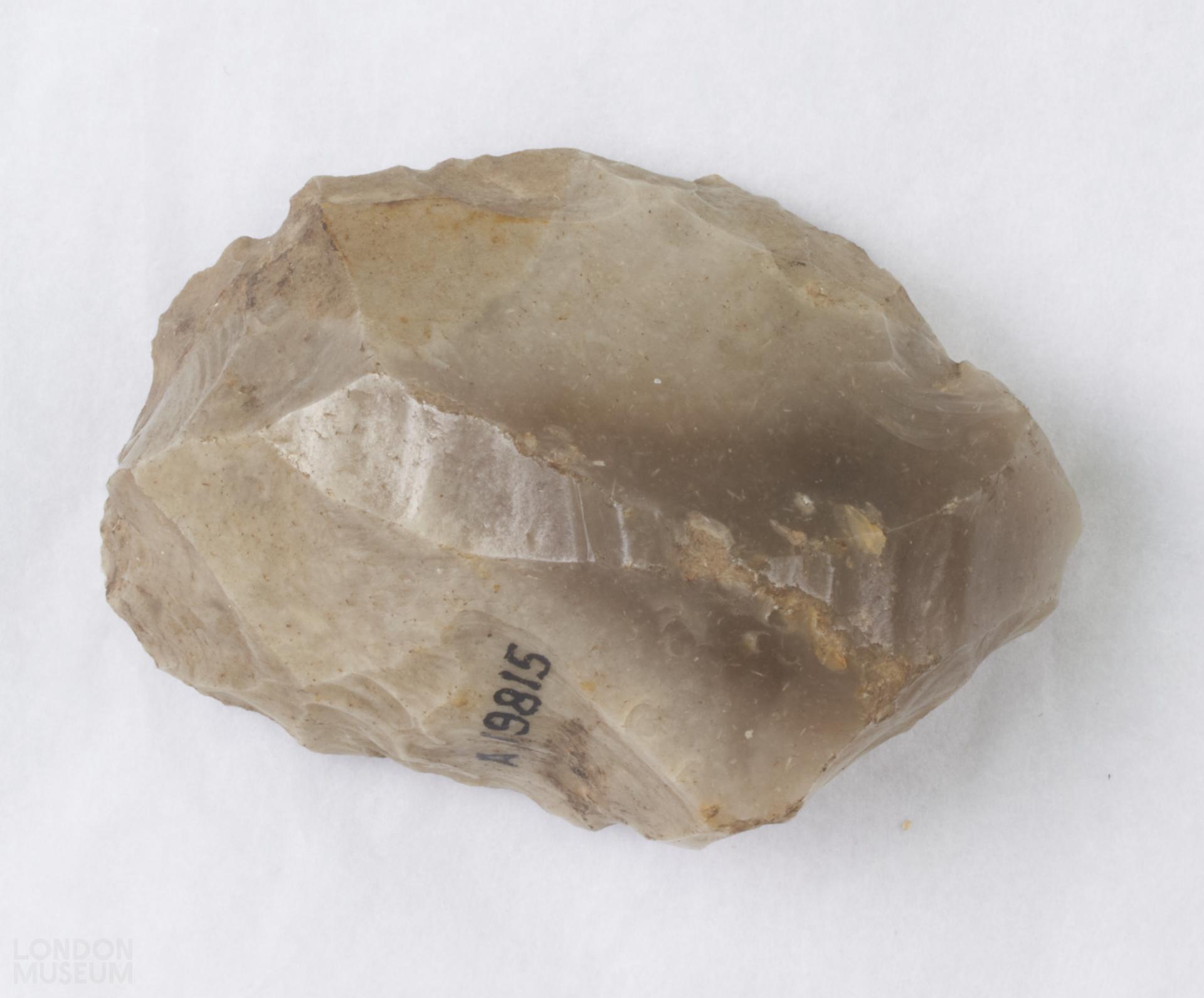 Flint scraper, grey colour. One flat side.