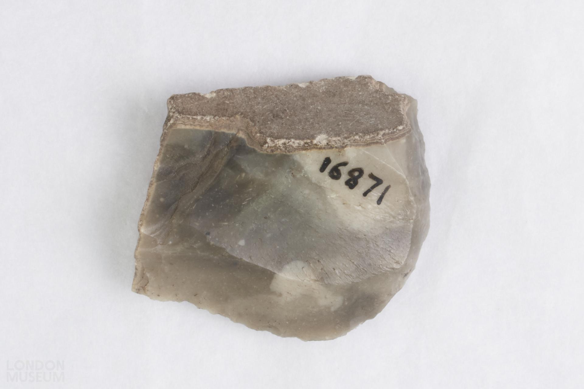 Flint scraper, two flat edges. Dark grey with lighter patches.