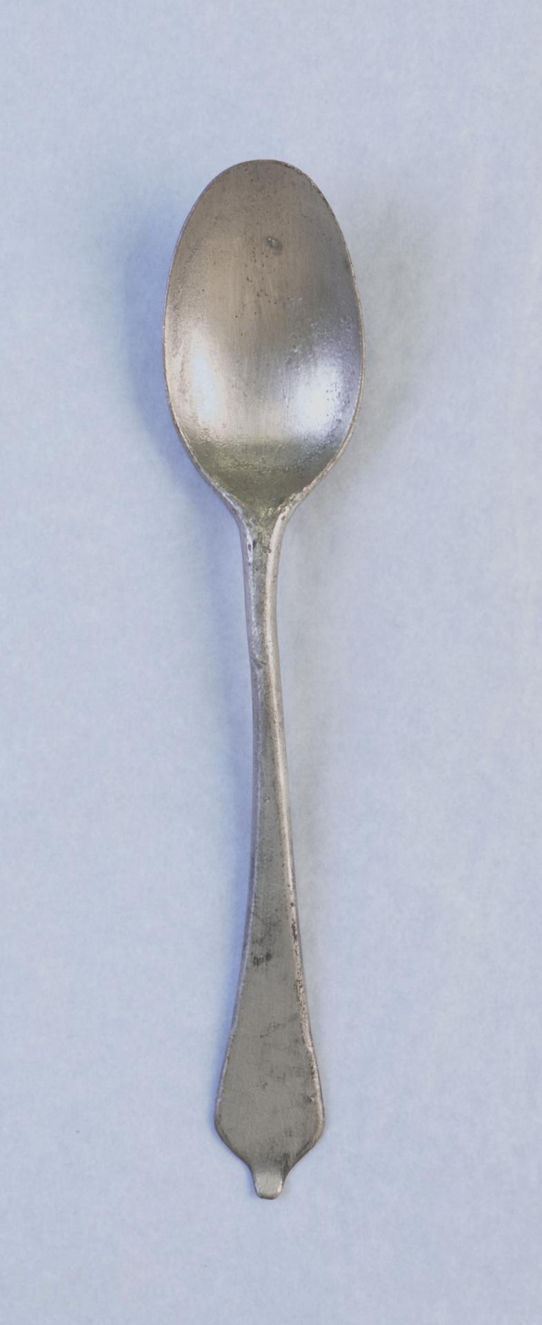 Pewter spoon with an oval bowl. The stem expands to a handle which narrows towards the end. The back of the handle is marked with the crowned letters 'C', 'I' and 'S' and the letter 'X'.
