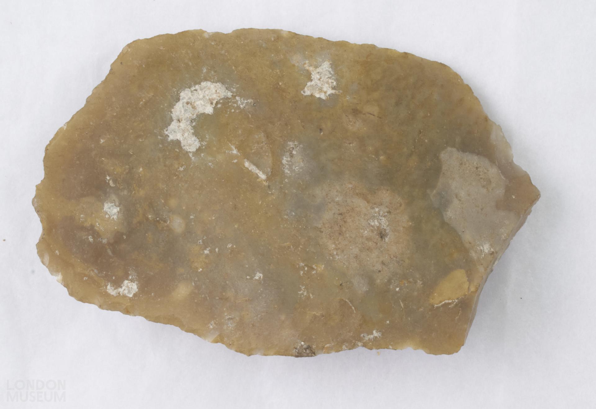Flint scraper, brown, retouched on three sides. Elongated shape.
