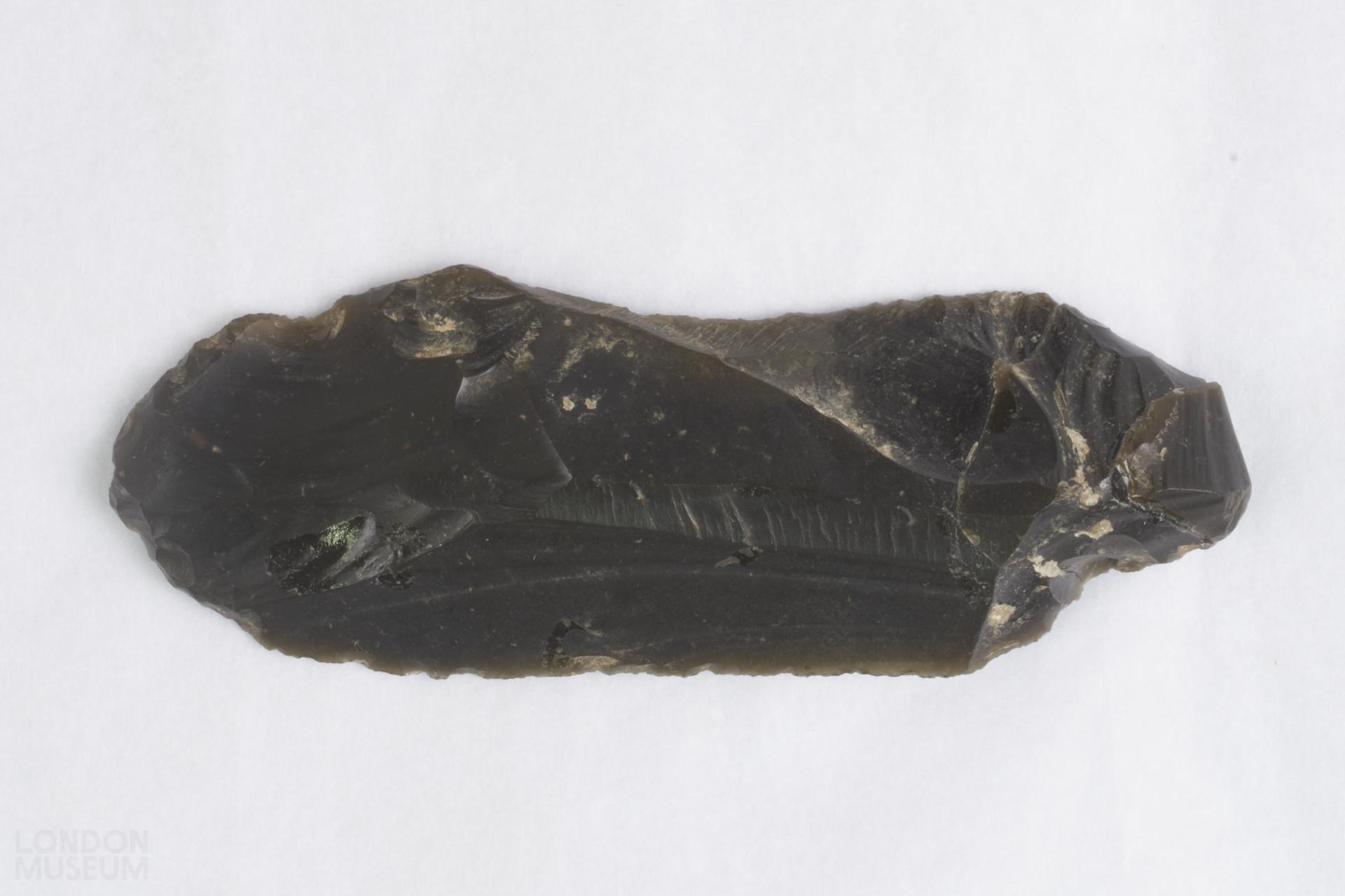 Flint scraper, black. Elongated shape, onme side ridged and one flat, slightly convex.