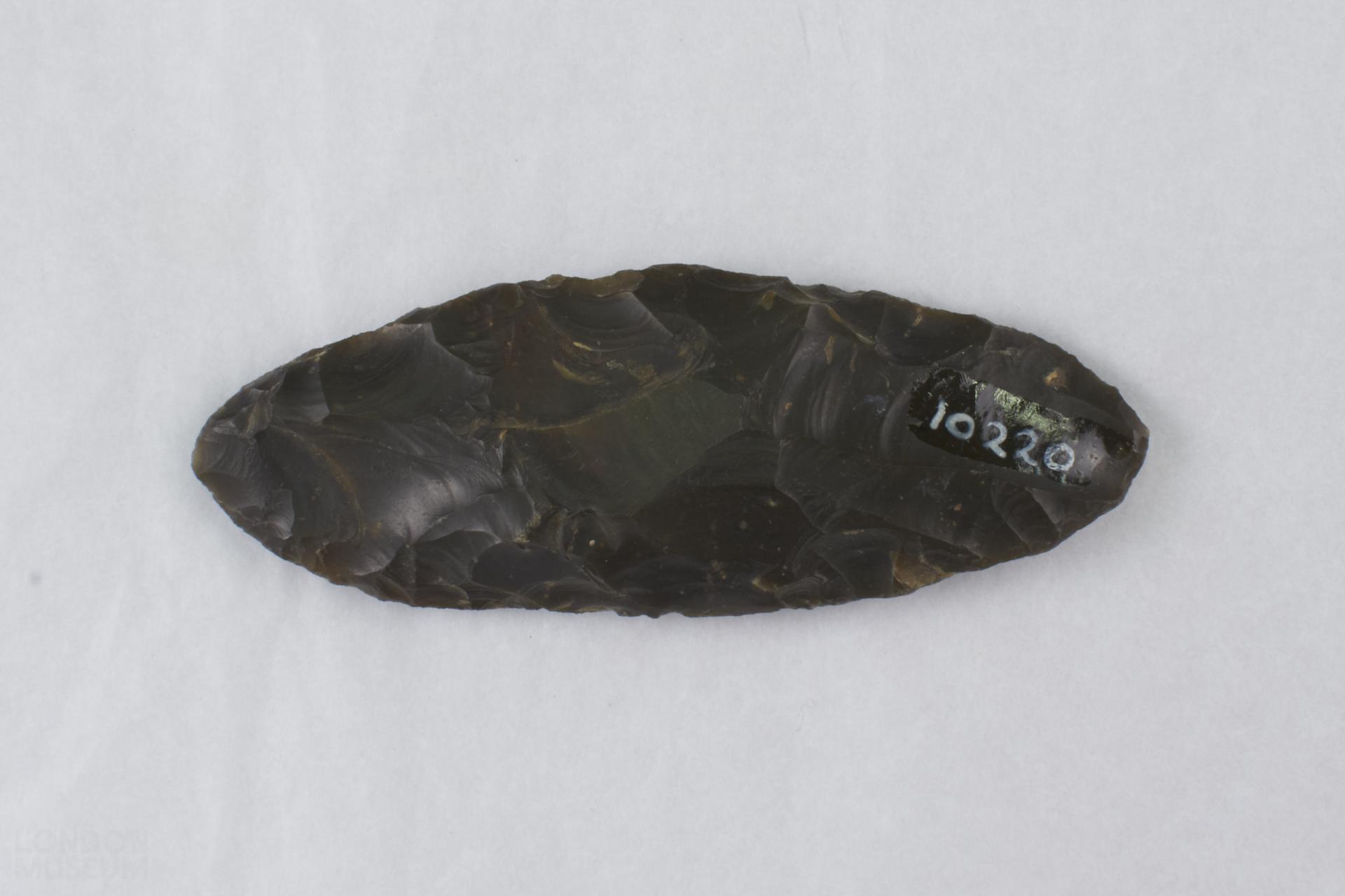 Flint laurel leaf point. Dark flint, with white marks on one face.