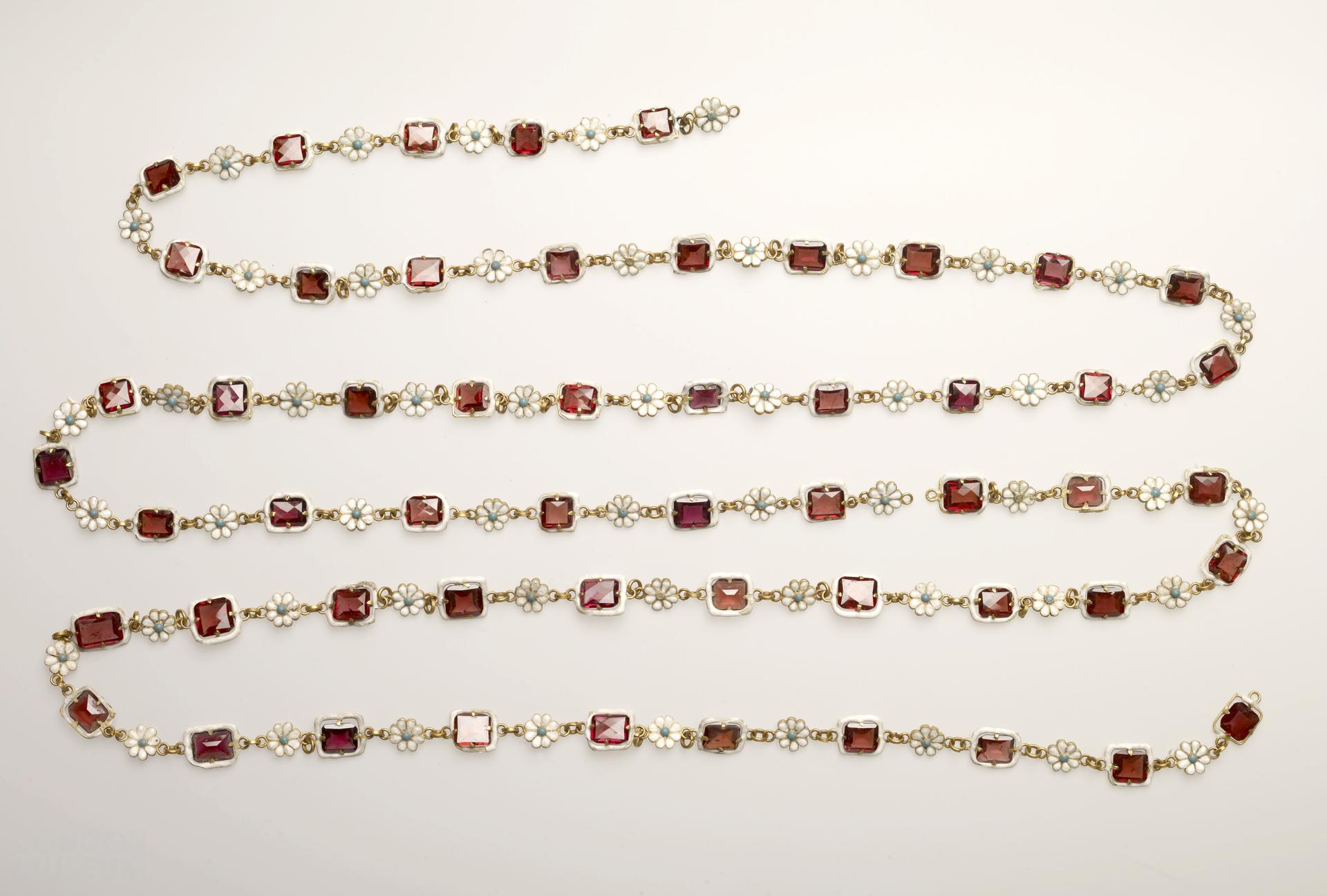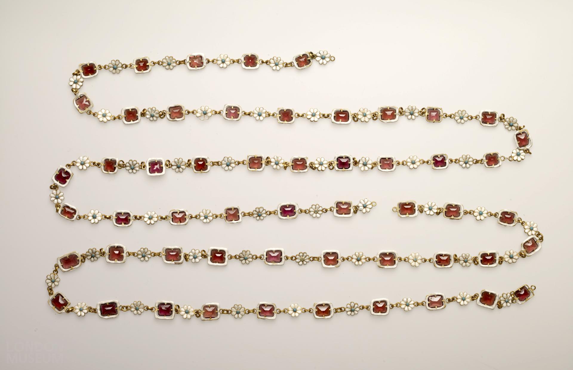 A gold and enamel chain set with almandine garnets. Part of the Cheapside Hoard.