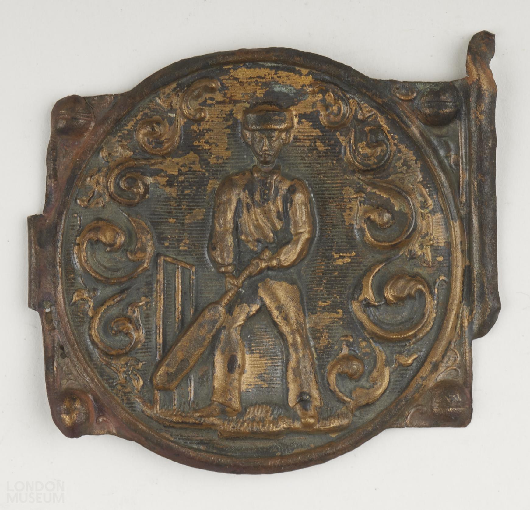 Pressed copper alloy cricketer's buckle, with traces of gilt. The buckle depicts a cricketer within a circular frame, with cricket balls at each of four corners. The cricketer sports a large moustache, and is dressed in a pill-box style cap, loose shirt, and loose trousers. He carries a long-handled cricket bat, and is poised to strike the ball. Behind him are the stumps, and scrolls frame the scene, on a background of fine, horizontal lines. The hinged part of the buckle is broken off. There was no standard form of dress for cricketers at this time, but many wore elaborate belts, sometimes woven in Berlin woolwork and with ornate buckles depicting cricketing scenes.