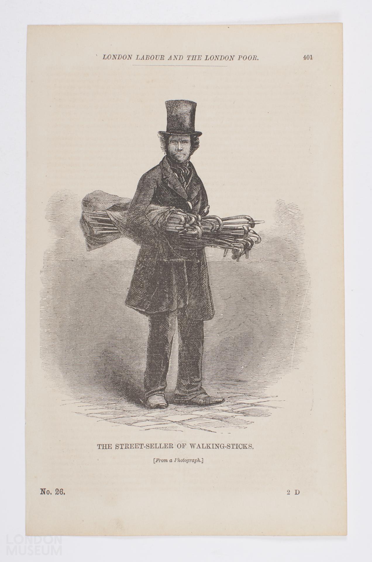 Engraved illustration based on a photograph, showing street seller of walking sticks. He wears a stovepipe hat and frock coat, and carries a bundle of assorted walking sticks wrapped in cloth under his arm. The illustration was published in Henry Mayhew's 'London Labour and the London Poor: The condition of those that will work, cannot work, and will not work', Vol. 1., 'London Street-Folk', first published in 1861. No. 28 page 401.