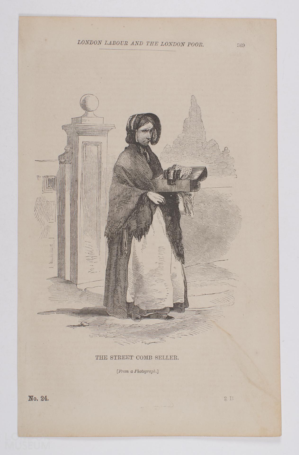 Engraved illustration based on a photograph showing a street seller of combs. She wears a bonnet and shawl, with an apron over her dress, and holds an open casket containing combs and other articles in one hand. The illustration was published in Henry Mayhew's 'London Labour and the London Poor: The condition of those that will work, cannot work, and will not work', Vol. 1., 'London Street-Folk', first published in 1861. No. 24 page 369.