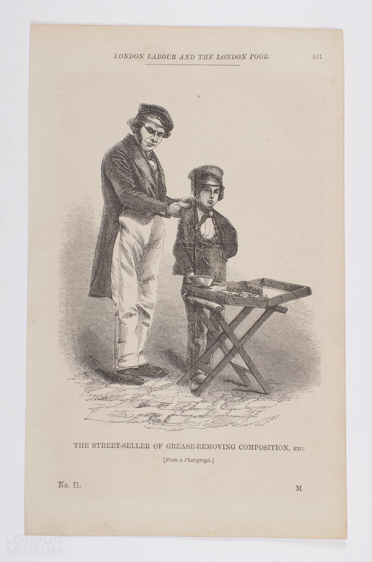 Engraved illustration based on a photograph showing a street seller of grease-removing cakes. The seller wears a peaked cap, tail coat and trousers, and is demonstrating the removal of grease from the collar of a boy dressed in a shako-style peaked cap, short jacket and trousers. His goods are displayed in an open box resting on a folding wooden stand. The cakes were made from pipe clay, ground and mixed with two colours, commonly red lead and stone blue. It had been a popular cleaning product when silk, woollen cloths and other textiles were expensive and durable, but the trade had declined and was used primarily for cleaning coat collars. The illustration was published in Henry Mayhew's 'London Labour and the London Poor: The condition of those that will work, cannot work, and will not work', Vol. 1., 'London Street-Folk', first published in 1861. No. 11 page 161.