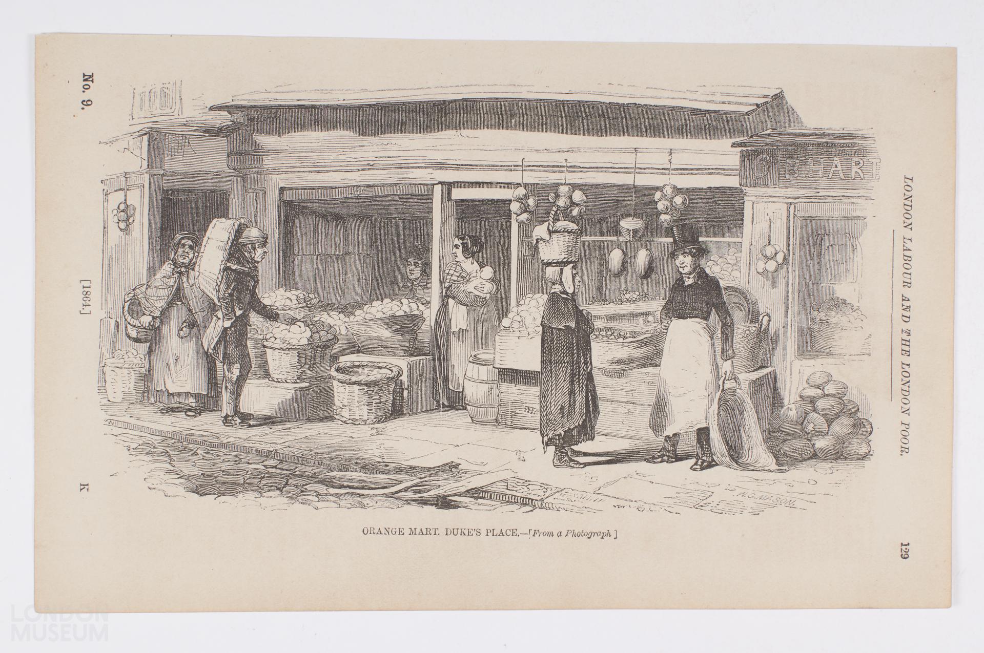Engraved illustration based on a photograph showing the orange market in Duke's Place. Costermongers and other street sellers purchased their supplies of oranges and other foreign fruit such as pineapples, melons, coconuts and grapes, from the mart at Duke's Place. The smallest quantity available was fifty. The oranges are arranged in large baskets outside an open-fronted shop. An assortment of customers are shown arriving with their baskets to purchase goods. A woman wearing a bonnet and ragged cloak is carrying a covered basket on her head. The illustration was published in Henry Mayhew's 'London Labour and the London Poor: The condition of those that will work, cannot work, and will not work', Vol. 1., 'London Street-Folk', first published in 1861. No. 9 page 129.