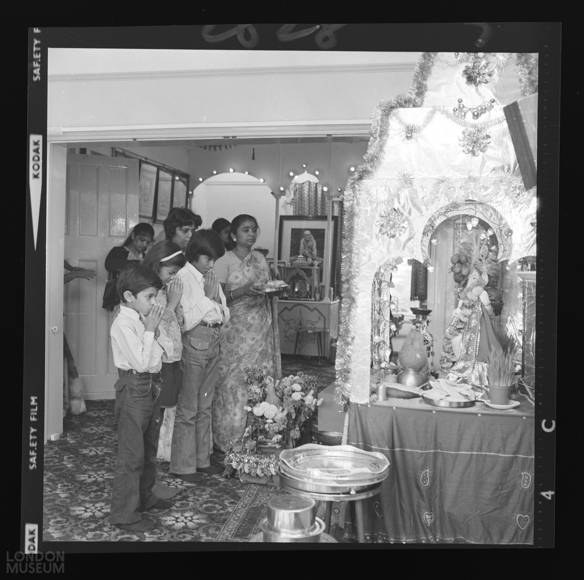 Worshippers gather at the Sai-Hindu centre in Golders Green to celebrate the 22nd Ganesh Festival in September 1973. The ten-day festival in late August to early September is dedicated to the deity Lord Ganesh. The Ganesha idol, in the centre of this shrine, resembles an elephant.