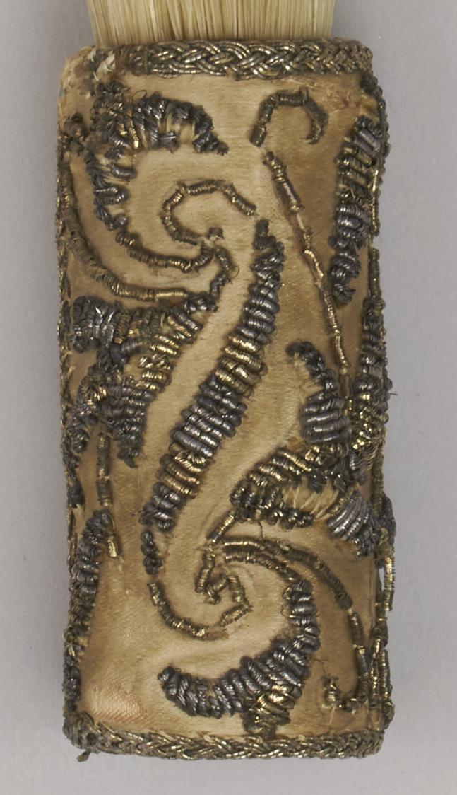 Shaving brush case. The cylindrical case, which is open at both ends, is made of hard leather covered with silk pieced from small scraps of fabric. It is embroidered with silver-gilt purl laid over padding, in a pattern of elongated curving stems and leaves. The edges and side seams are covered with a narrow braid of plaited silver-gilt thread. Such brushes are likely to have been among the contents of the embroidered caskets of the mid to late 17th century. [Santina Levey's notes]