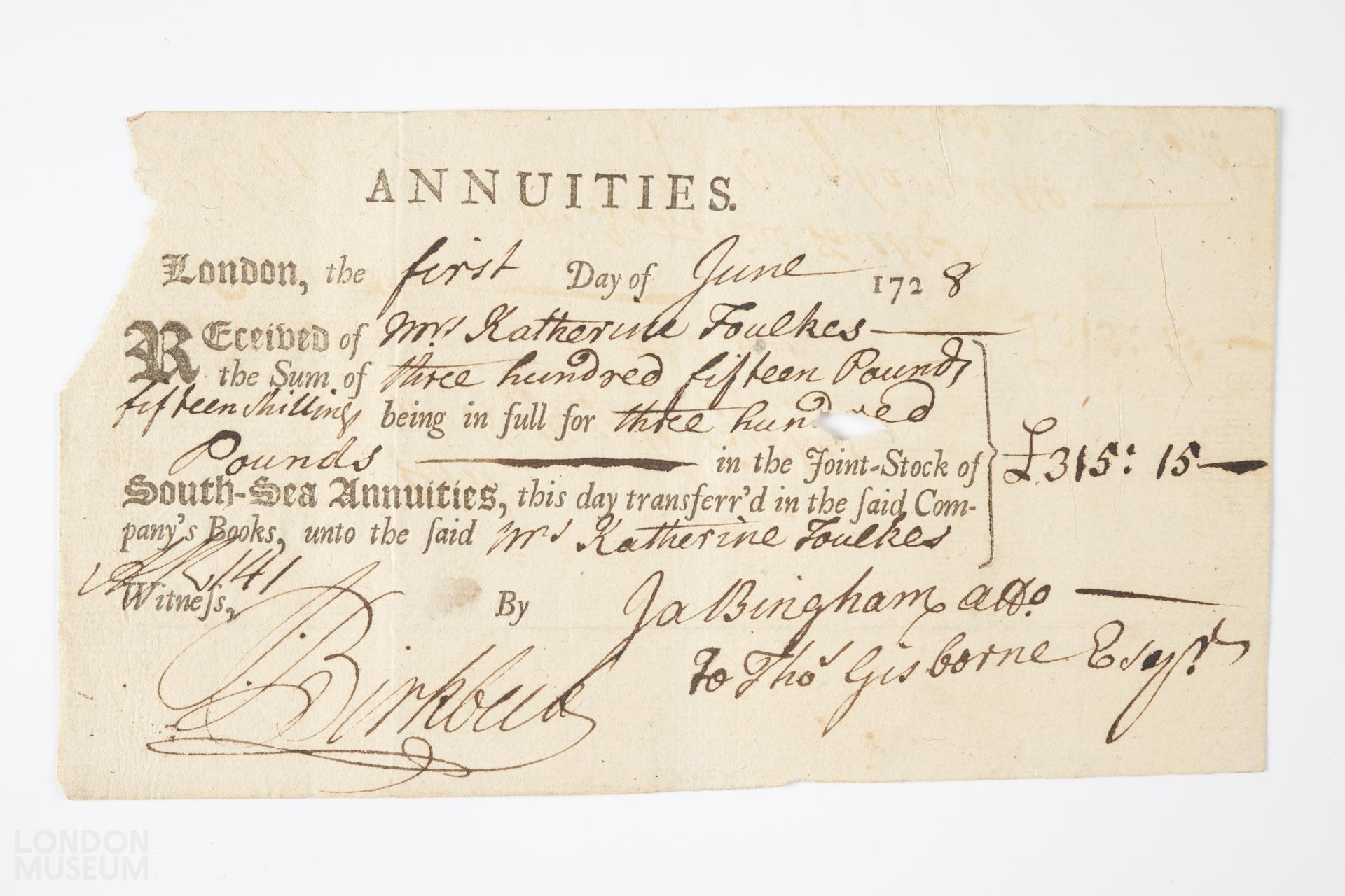 This annuity, dated 1st June 1728 is one of several in the Museum's collection relating to Mrs Katherine Foulkes investment in the South Sea Company between 1720 and 1728 indicating she continued to invest in the company following the 1720 collapse and may not have suffered the same financial loss as other investors. The South Sea Company continued to trade until 1853 but despite public confidence in the Company trade and profits failed to reach the high expectations of loyal investors.