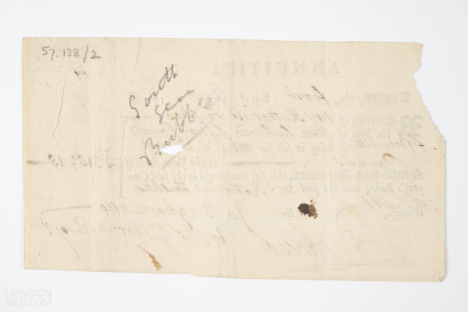 This annuities share certificate issued in payment for stock in the South Sea Company represents the greed of both private and state investors hoping to capitalise on the financial opportunities of Europe's expanding empire in the 18th century, including the transatlantic slave trade.The South Sea Company was founded in London in 1711 during the War of the Spanish Succession on the basis that it would enjoy a post-war monopoly on trade with Spanish colonies in South America, primarily the sale of enslaved Africans. The Company's first voyage took place in 1717 and despite only modest success the potential of the Company encouraged large and small investors, including King George I to purchase shares in the Company. As Parliament agreed to convert significant portions of the national debt into Company shares the directors exaggerated its successes in order to generate more investment. In 1720 share prices peaked to unprecedented levels due to frenzied demand. The following month the market crashed and many of the Company's investors were ruined as the 'South Sea Bubble' burst. A House of Commons investigation revealed high level corruption in both the Company and the British government.