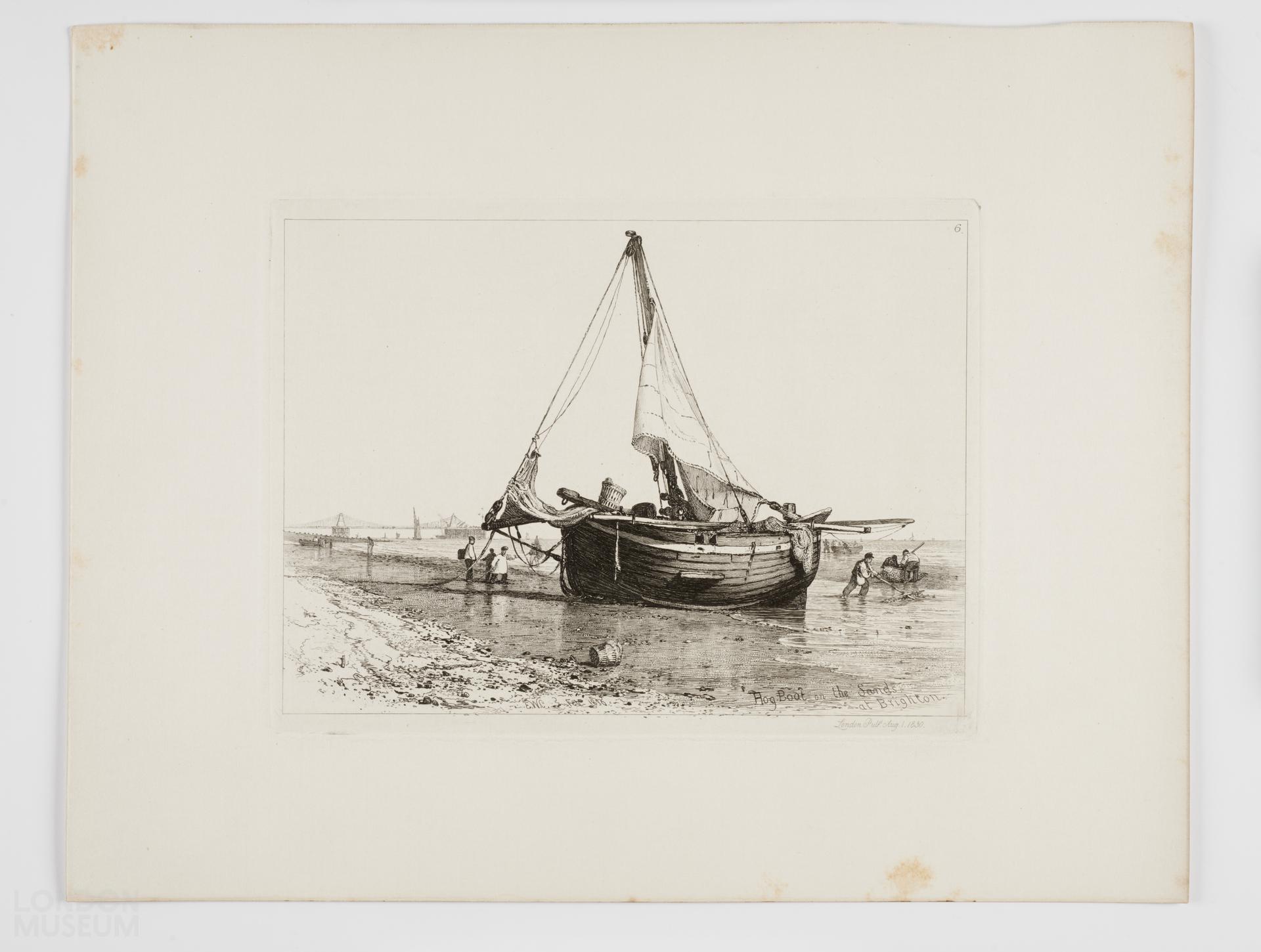 'Hog boat on the sands at Brighton'. No. 6 of the 1830 series of etchings of shipping and craft, drawn and etched (Feb 1830) by E.W. Cooke.
