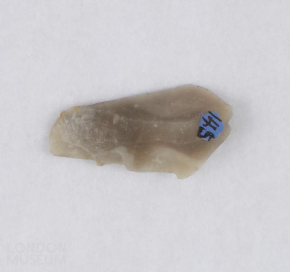 Bladelet made of grey flint flake. Visible central ridge with steep retouch along the edges.