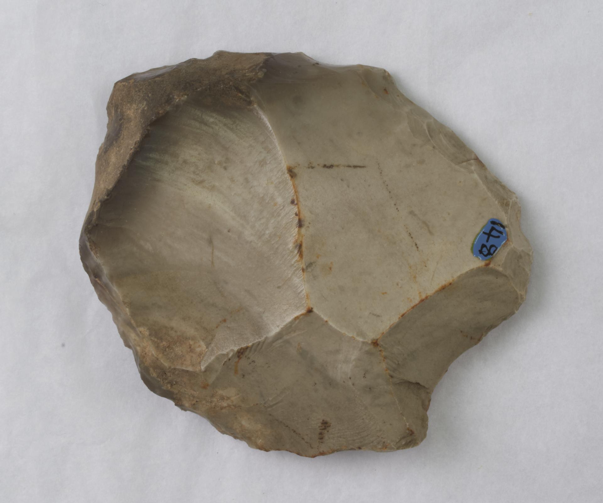 Flint scraper. Possibly a disc scrapper. Roughly circular in shape. Nearly the whole edge has been retouched. Smooth on one side.