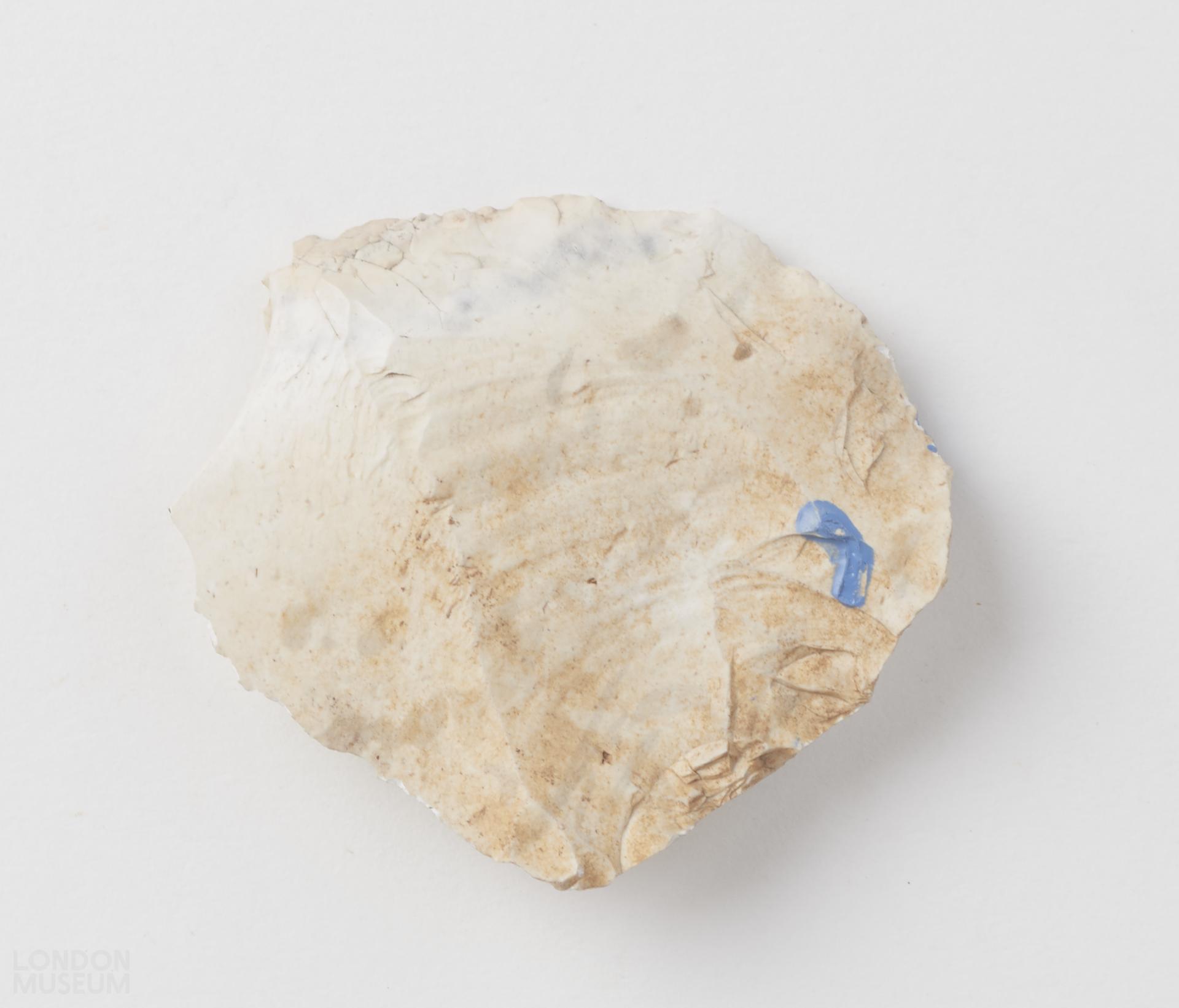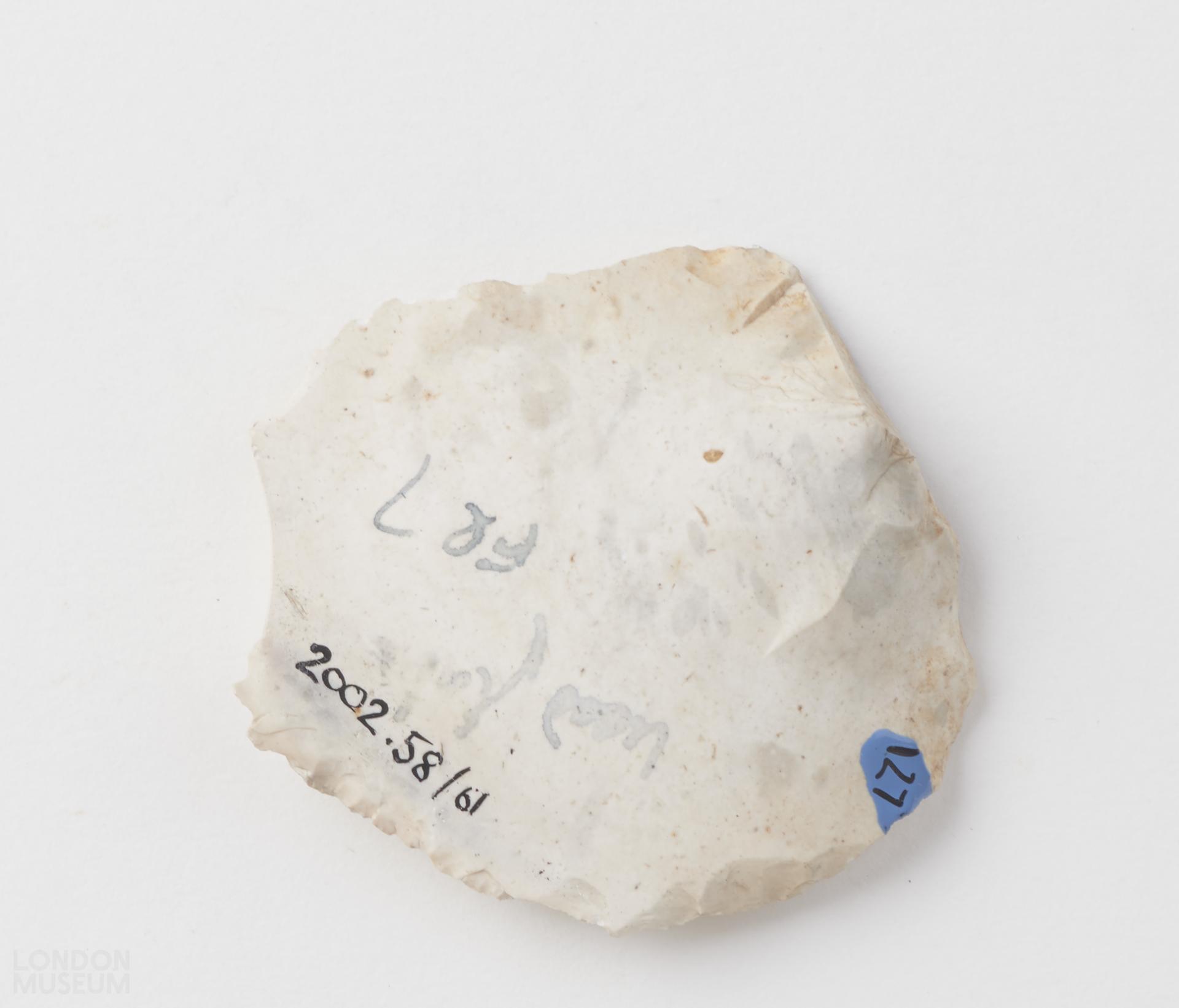Flake, possibly a scraper, white in colour. Striking platform on the ventral side with a significant point of percussion and conical ripples on dorsal side.