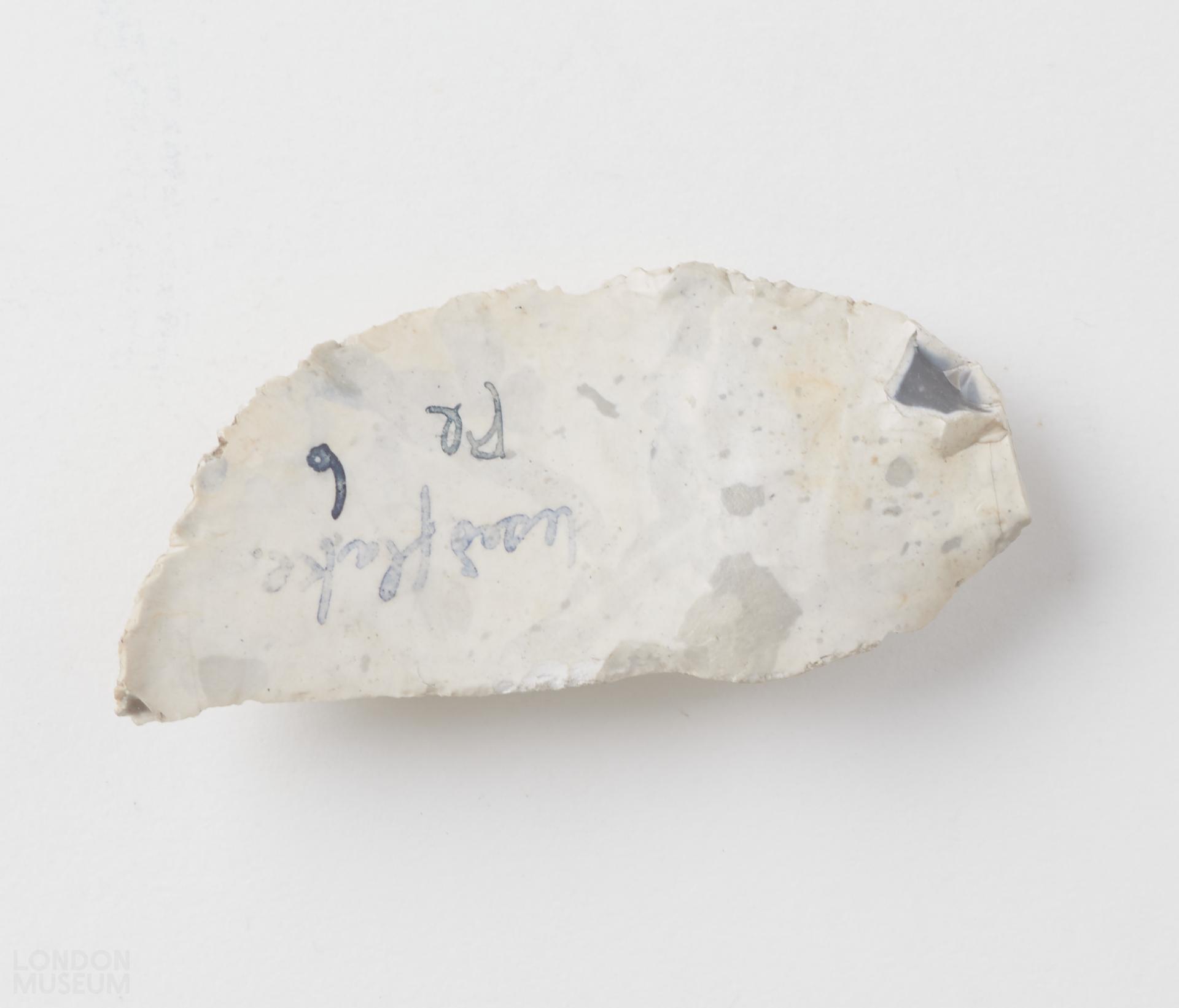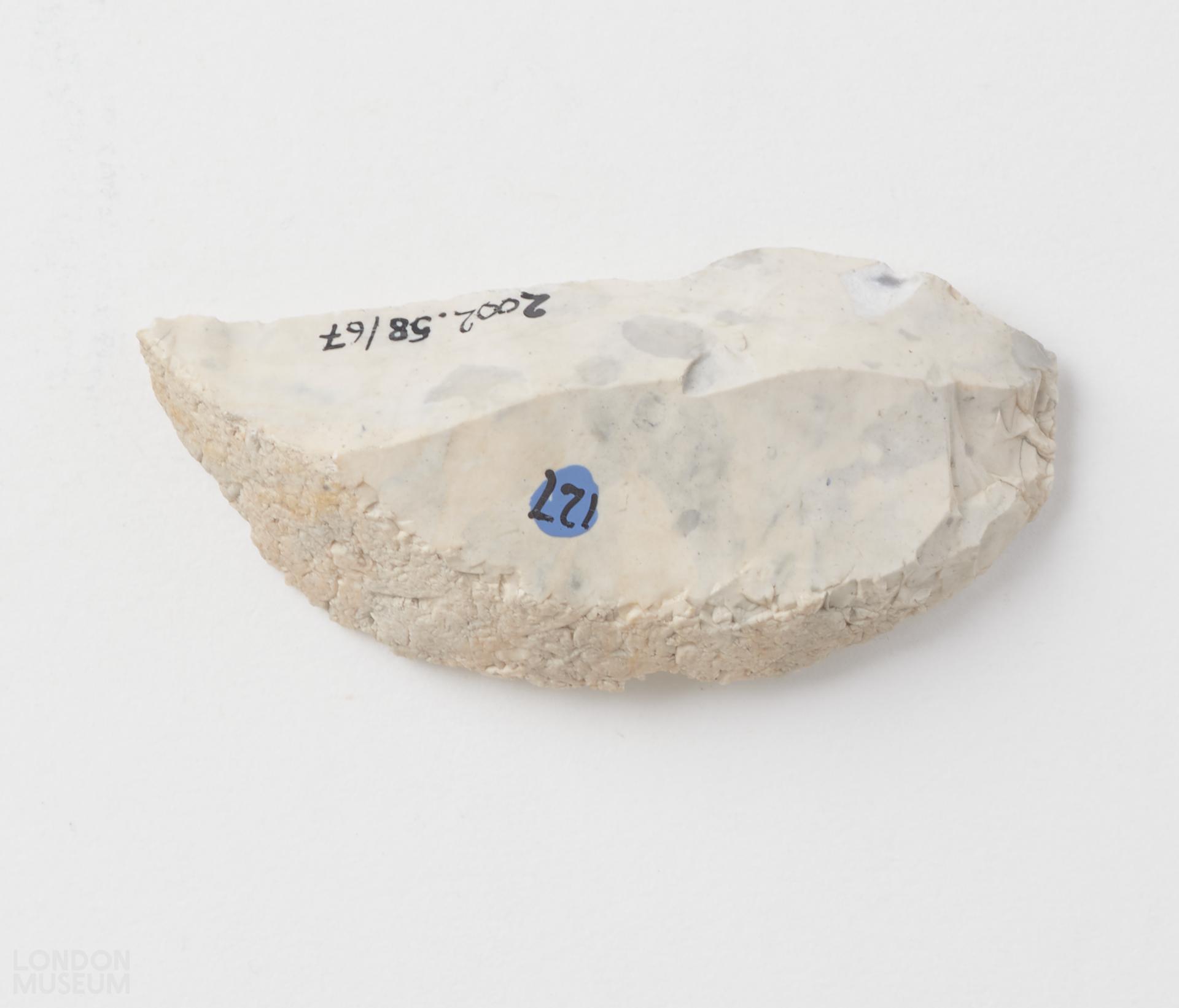 Convex scraper, white in colour, striking platform and point of percussion visible on the ventral side.