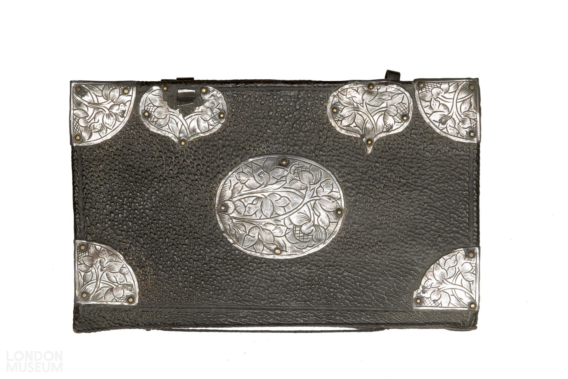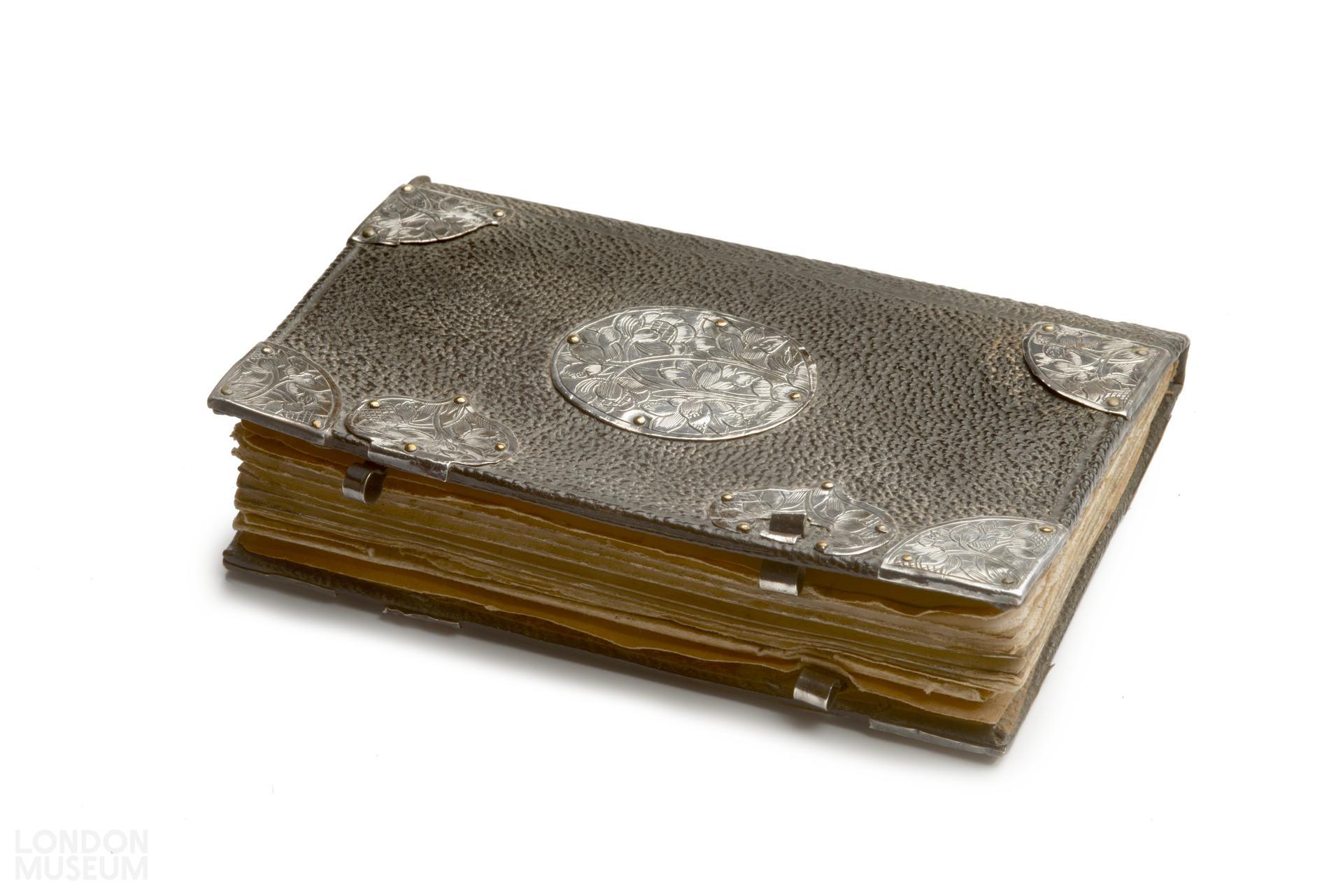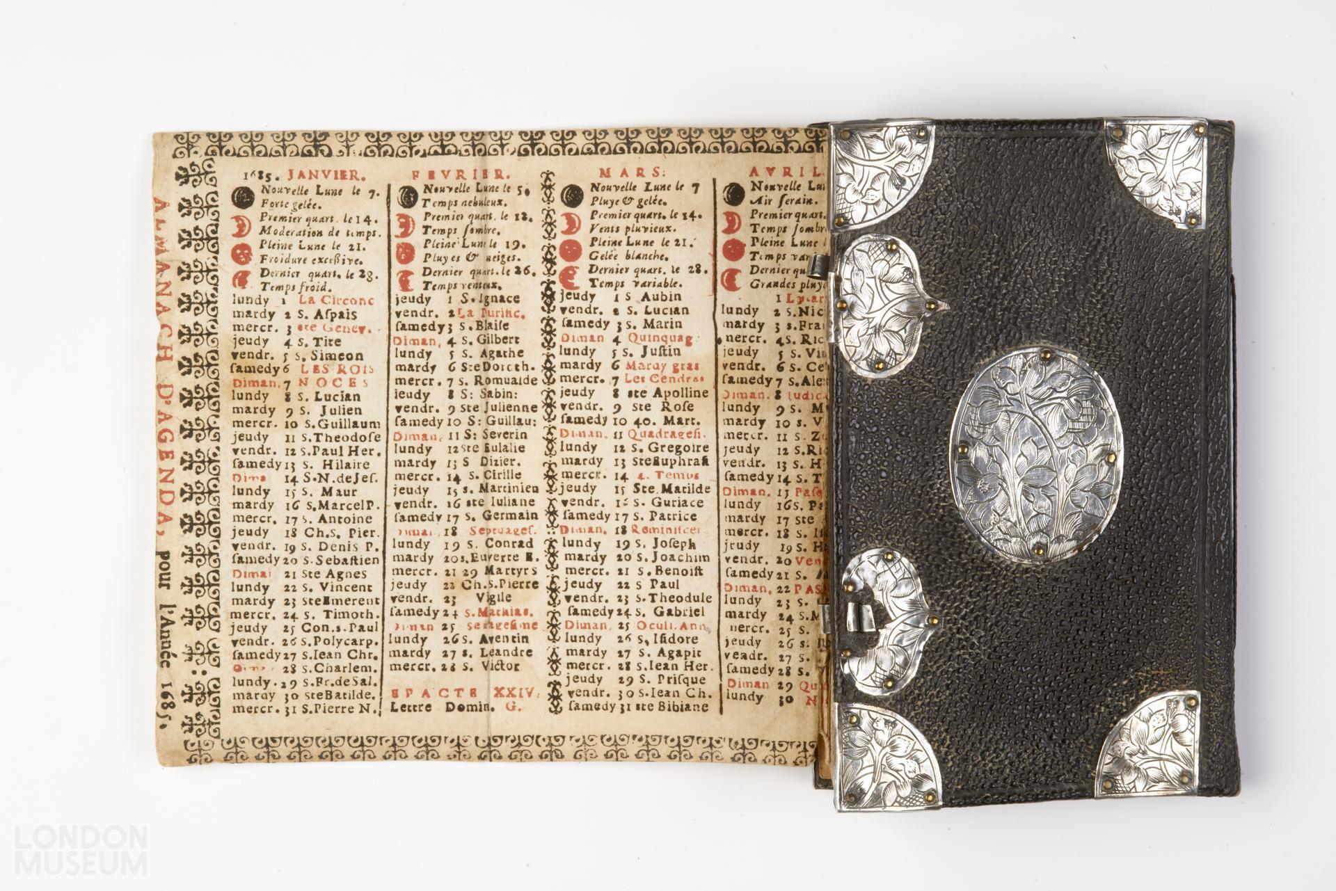Pocket book made of leather and chased and engraved silver, dated to 1685. It includes a list of Christian holidays and saint feast days.
