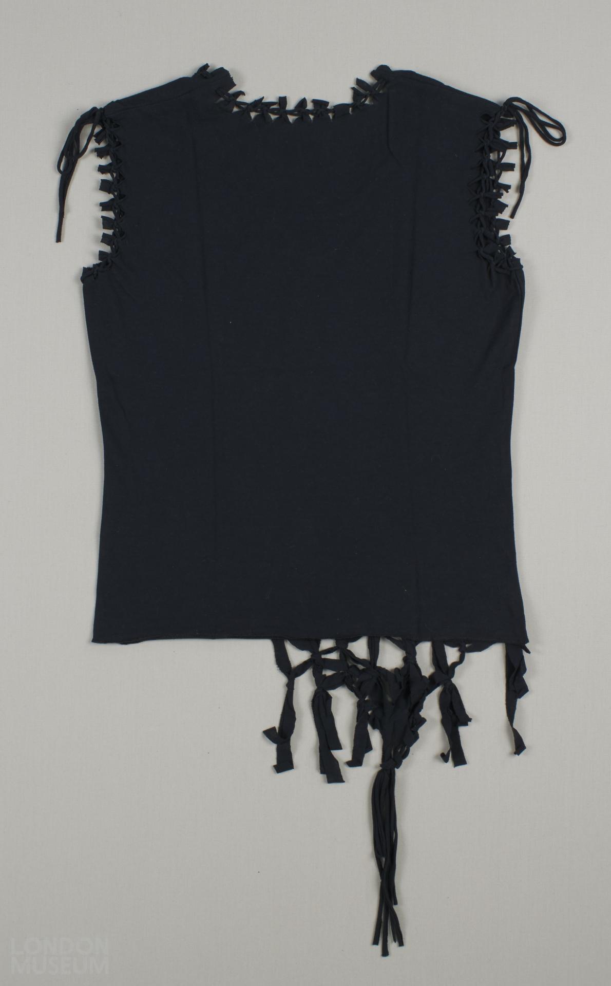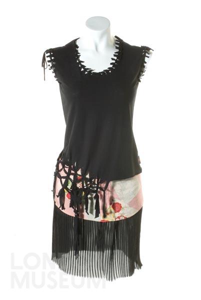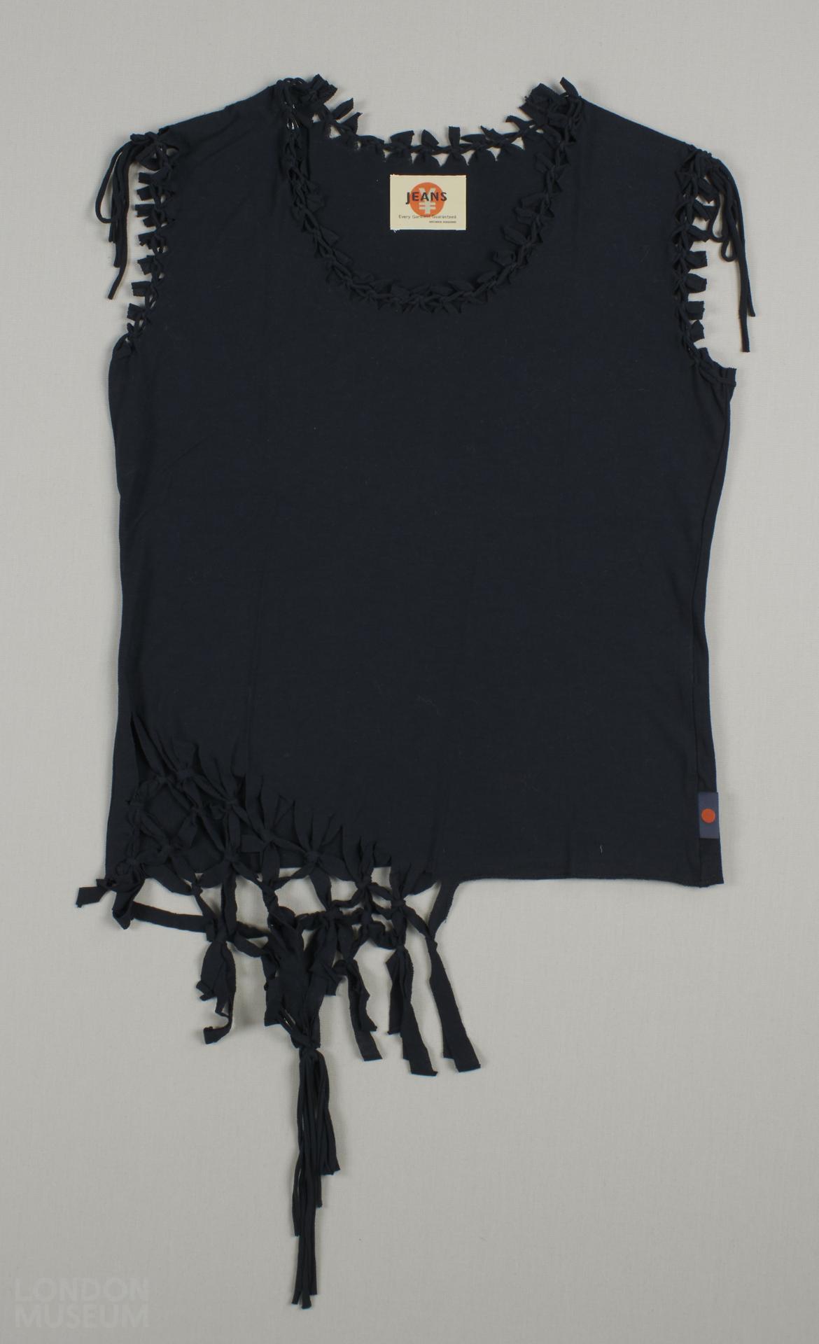 This top is from her Yen denim label, which she refers to as 'retaining its original oriental concept but with a modern twist'. The black t-shirt has been cut and knotted to create an intricate fabric pattern along the shoulders and the lower part of the torso.