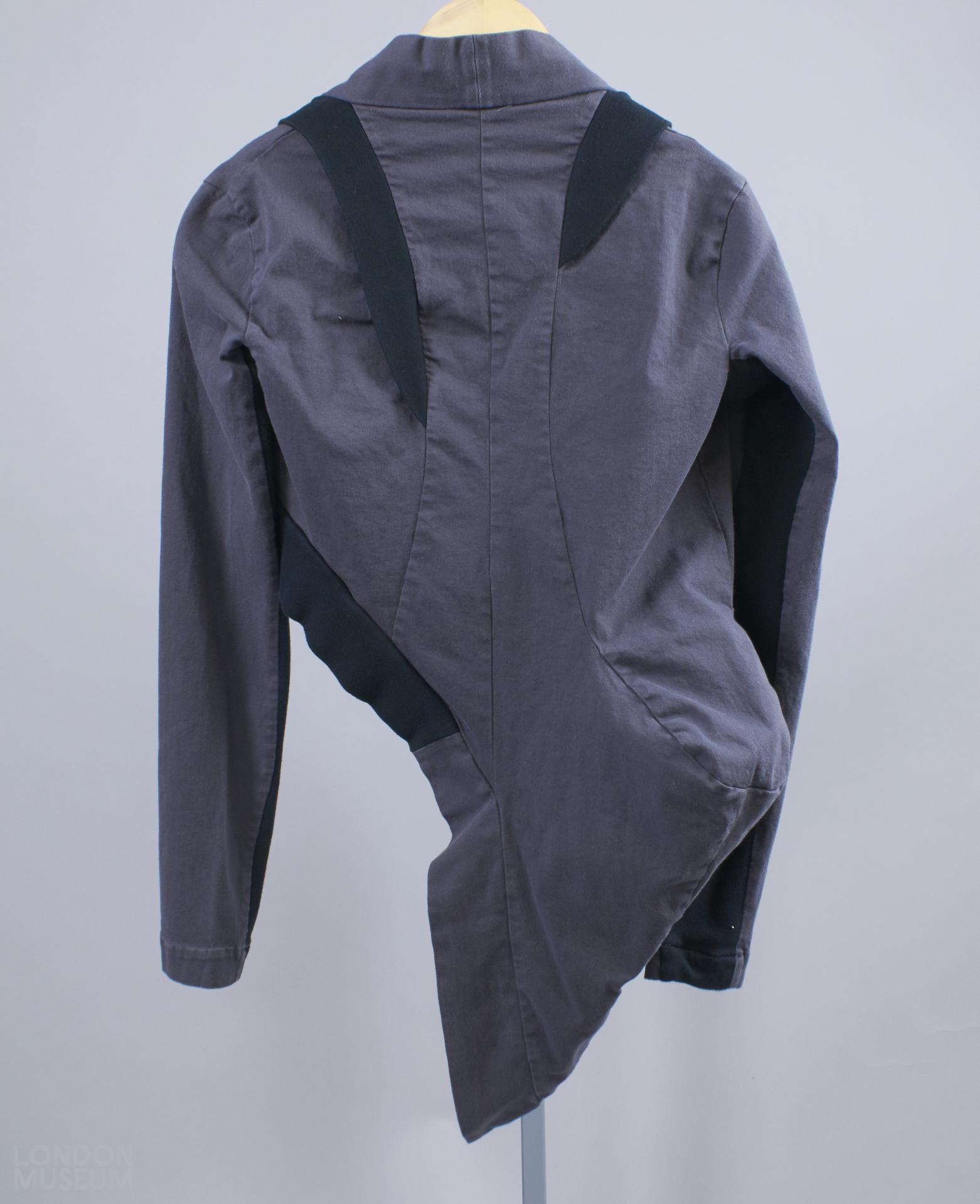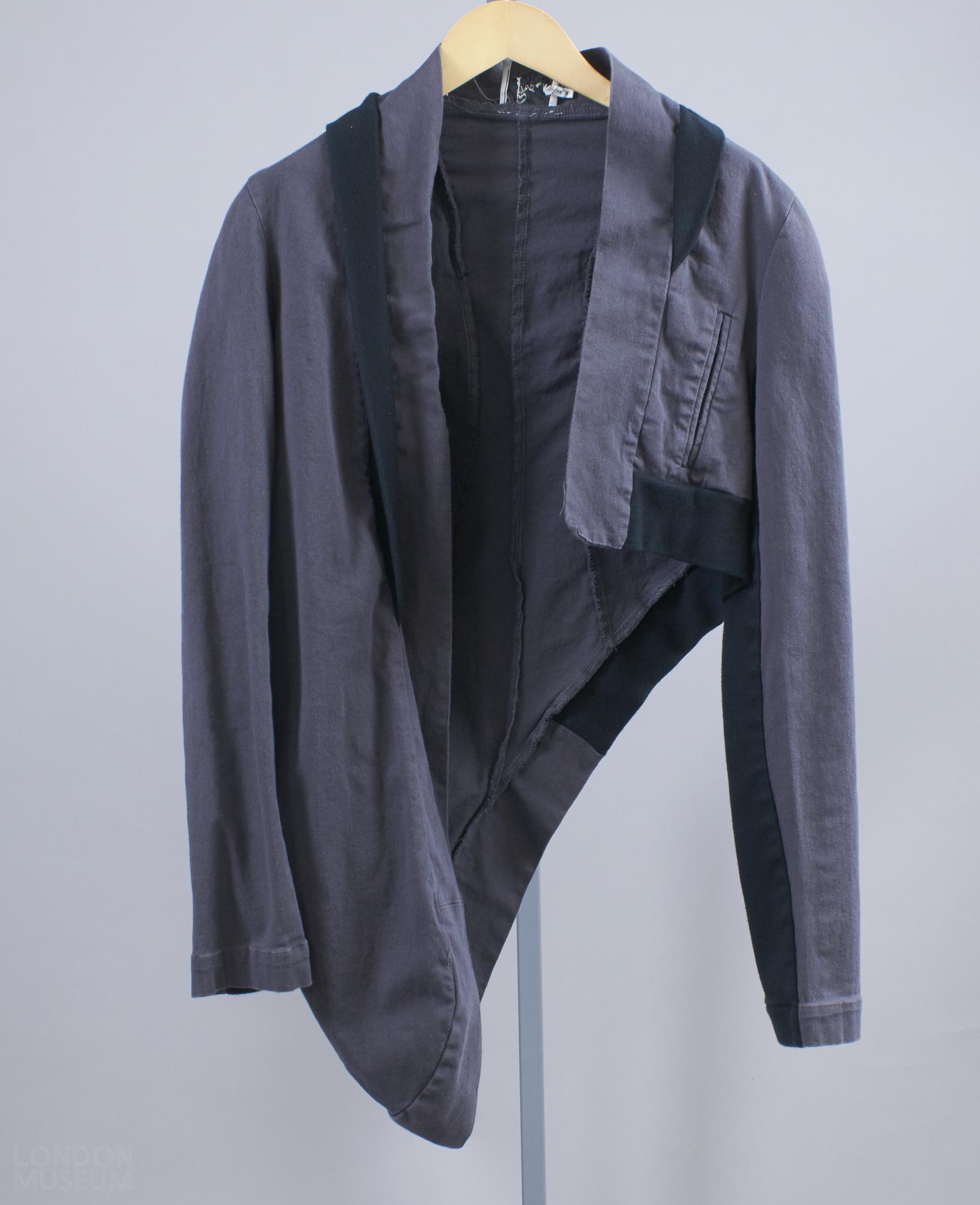 A dark grey cotton jacket with black ribbed jersey edgings. The LHS front has a vertical slit pocket, the panel ends above the waistline with a black ribbed edging that continues around the side and finishes at the back LHS. The RHS panel begins at the shoulder and continues to a length of about 80cm, the bottom seam is diagonally shaped with a point at the front edge. A wide flat band begins on the LHS of the front, becomes the neck collar and travels down the RHS front meeting the black ribbing on the back LHS. A decorative flange of black ribbing starts above the breast on the LHS, between the flat neck band and the panel and continues along the shaped seam on the back RHS, finishing mid-back.