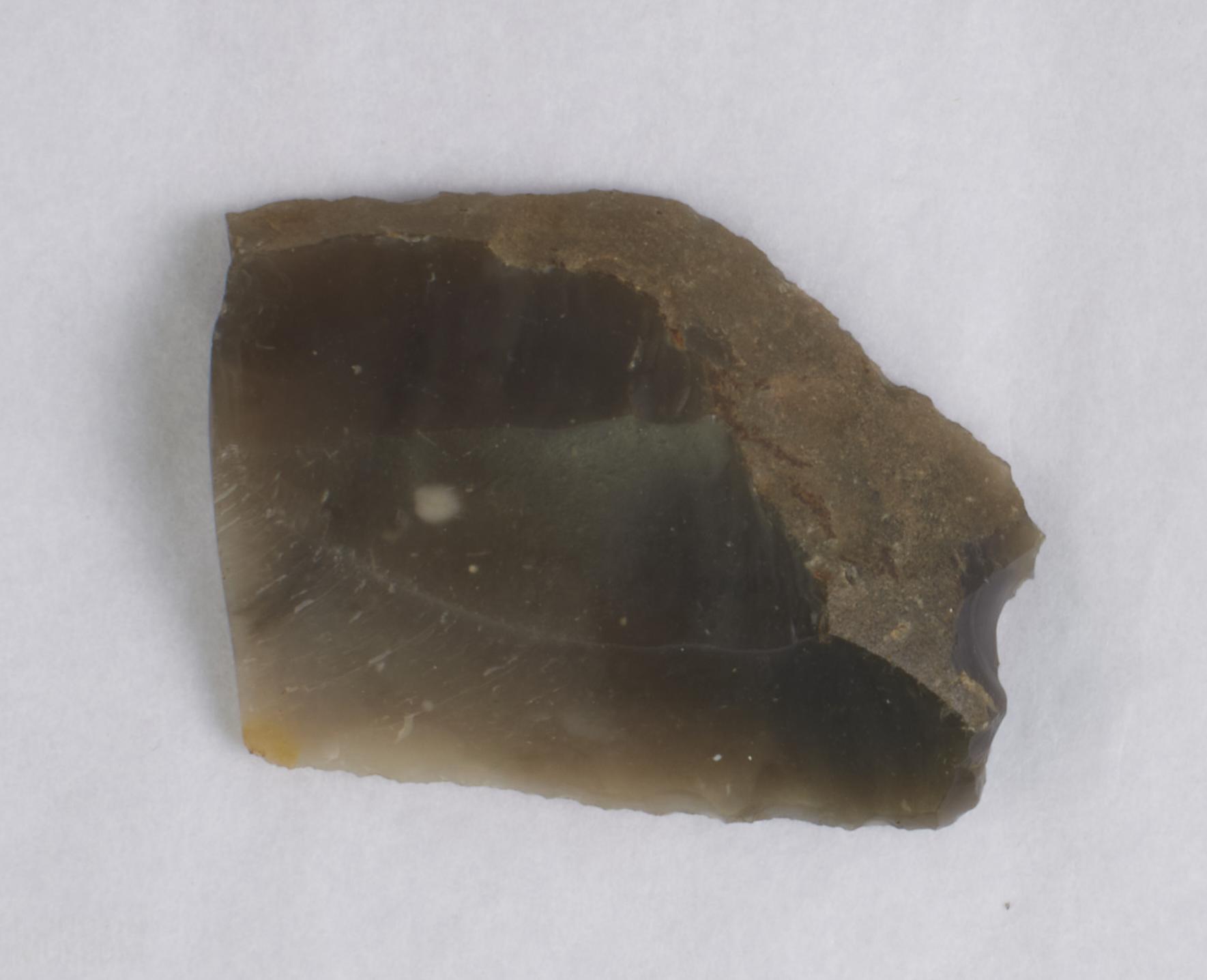 Dark grey backed knife with cortex along the backing, and the sharp edge utilized or retouched. Broken through transversely.