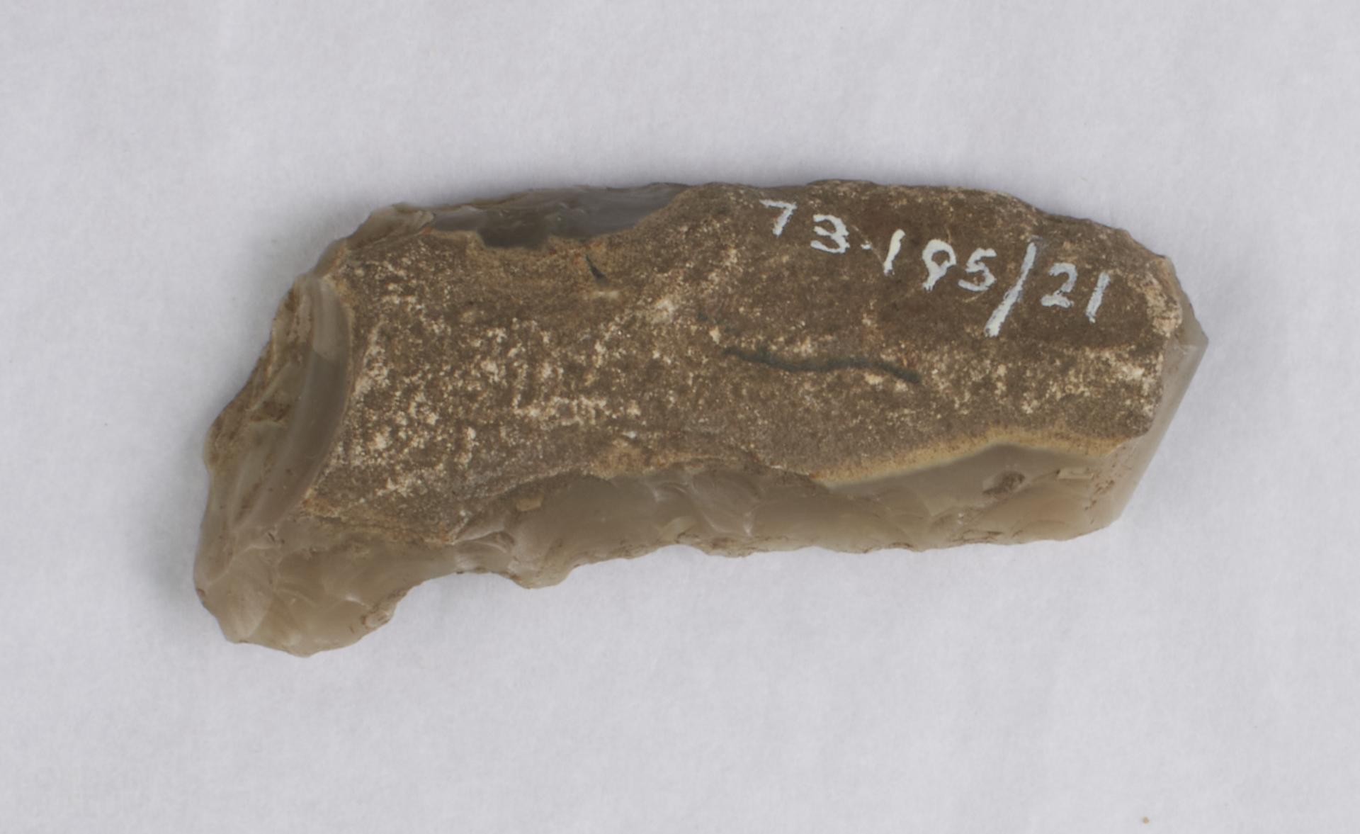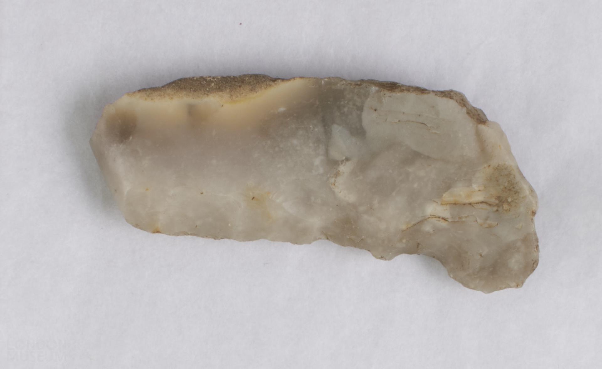 Grey / white backed knife with much cortex on dorsal side and retouch on concave edge.