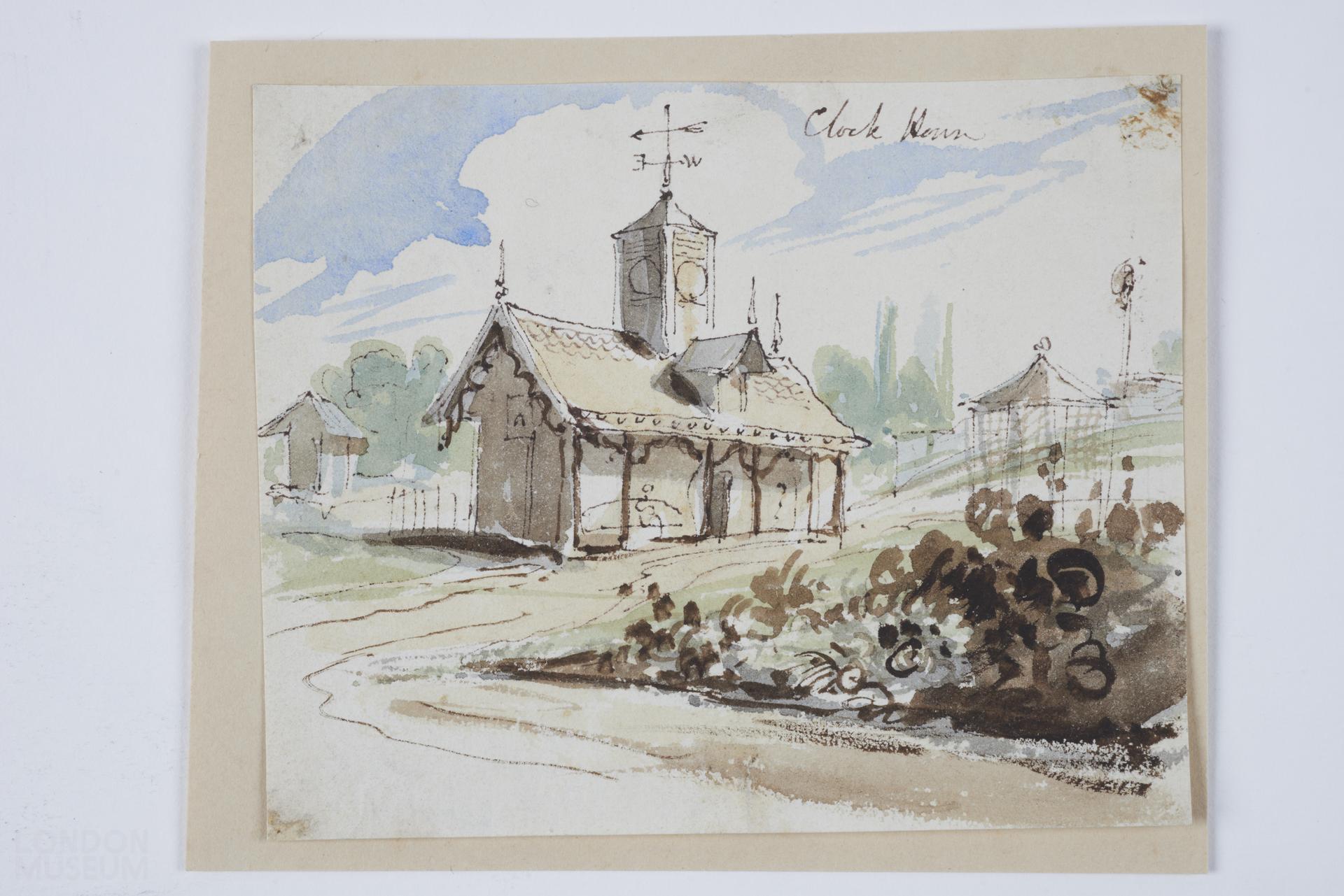Watercolour sketch of the 'Clock House' with weather vane in the Zoological Gardens in Regent's Park, c. 1828 - Decimus Burton's Llama House. The sketch is part of a series of 23 drawings, 2004.158/1-23. Five are dated June/July 1828. The Zoological Society of London founded in 1826 established their collection of animals in the Park in 1828, attracting 30,000 visitors in the first seven months. The menagerie initially included monkeys, bears, emus, kangaroos, llamas, zebras and turtles.