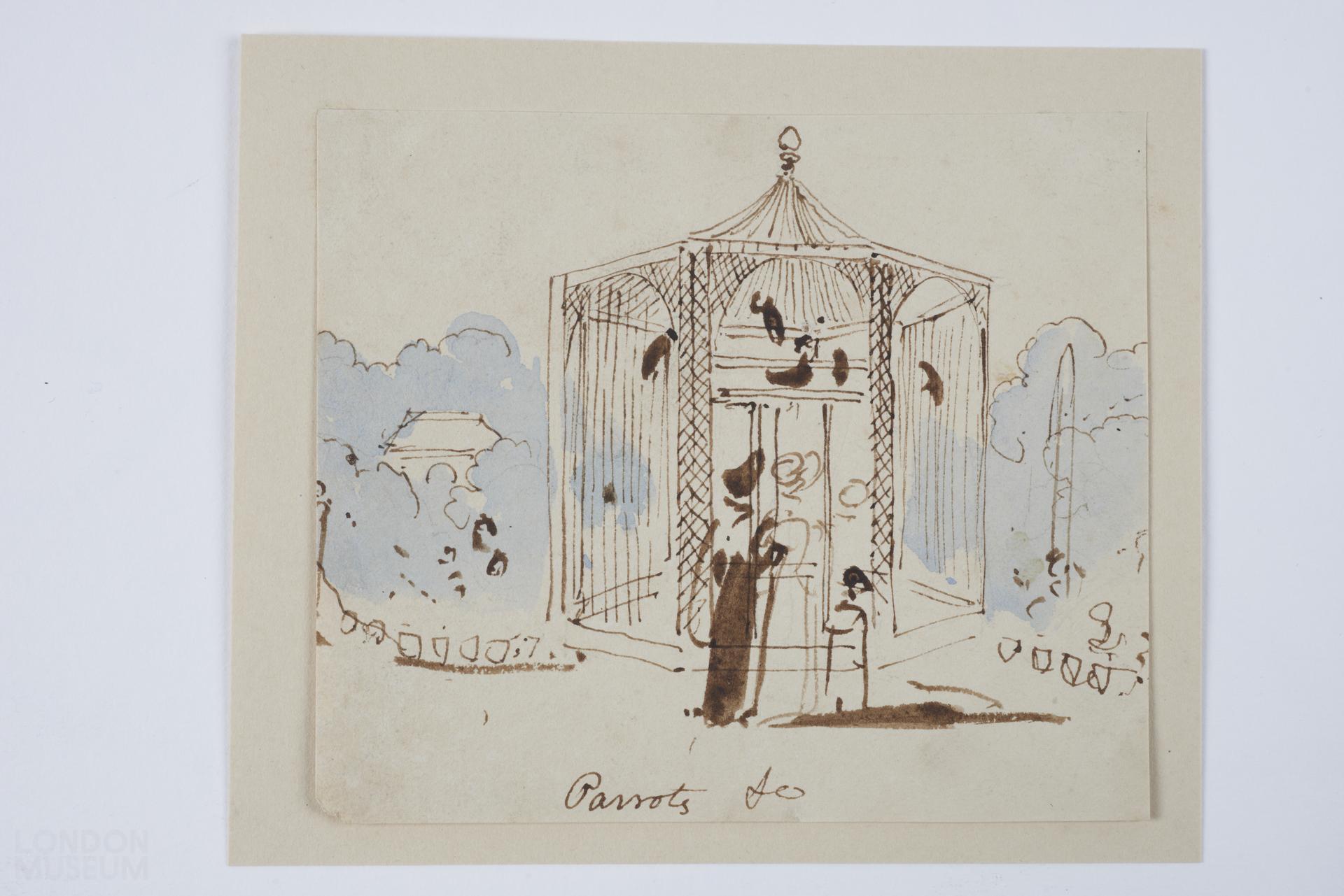 Watercolour sketch of the 'Parrots' in their enclosure in the Zoological Gardens in Regent's Park. The sketch is part of a series of 23 drawings, 2004.158/1-23. Five are dated June/July 1828. The Zoological Society of London founded in 1826 established their collection of animals in the Park in 1828, attracting 30,000 visitors in the first seven months. The menagerie initially included monkeys, bears, emus, kangaroos, llamas, zebras and turtles.