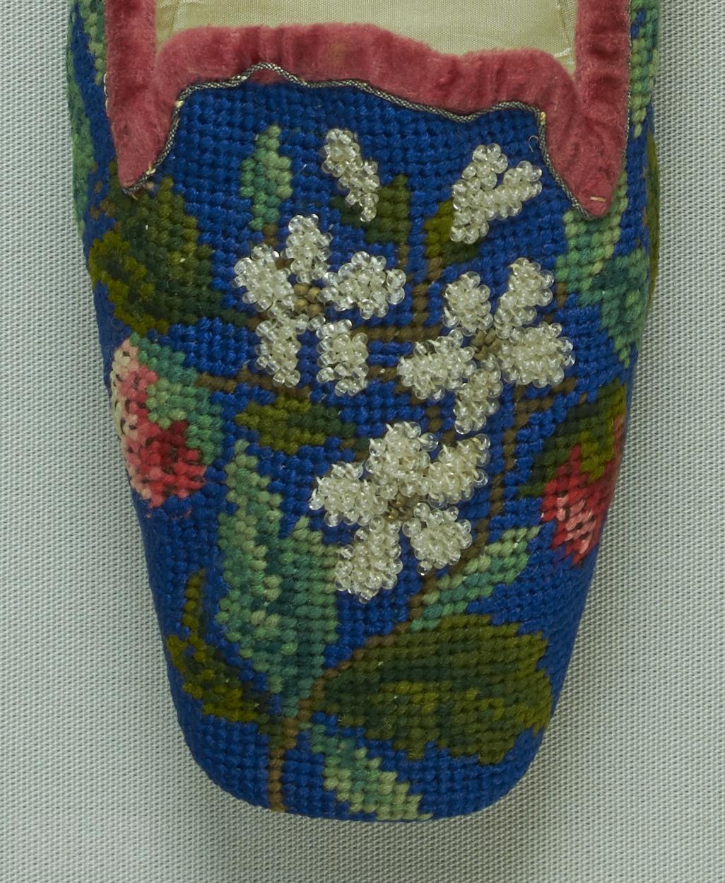 Not professional embroidery. Probably from a design on squared paper obtained from a woman's journal or an embroidery supplies shop. Shoes made up professionally.