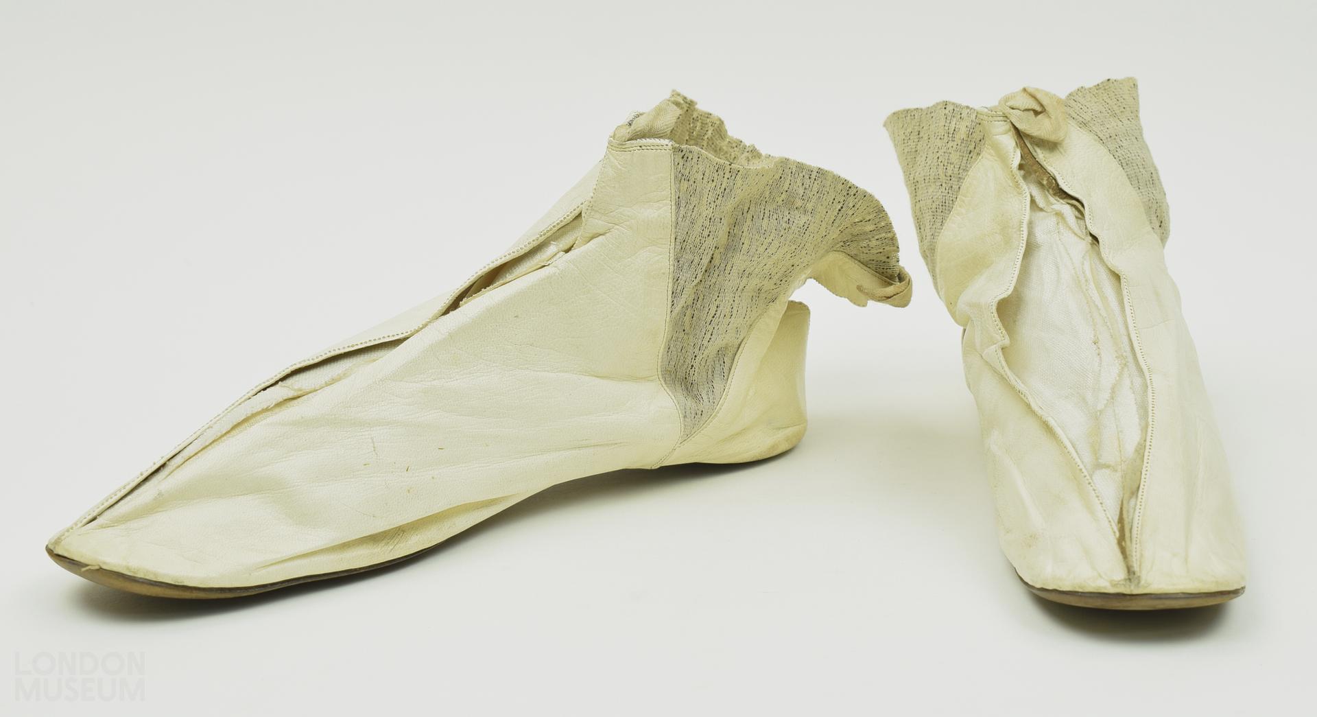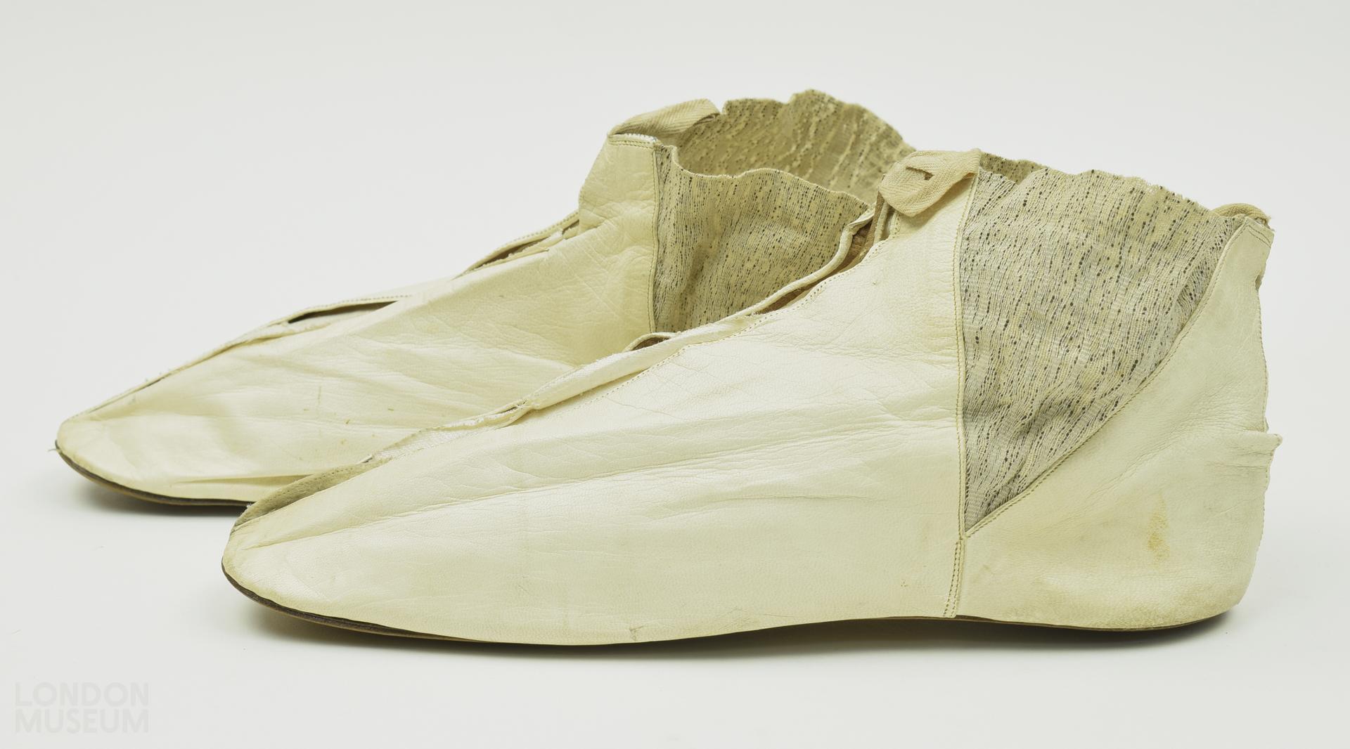 Woman's ankle boots (pair). Elastic sided white kid boots. Leather sole. Rounded toe. No heel. Shaped sole; iron red edge finish at waist, worn outdoors, sueded at waist, stamped 'DB' within a circle and '5' at toe [CIUP note 2020-11-17 - 'DB' in circle at waist, '5' not seen]. Turnshoe construction. Front, back and side seams machine sewn producing V shaped elastic gusset. White/brown welt in front seam, pasted to upper. Braid loop front and back to pull. Natural linen lining inscribed '5' over '278'. Substantial brown leather stiffener between upper and lining (visible therefore stitches broken); white kid side linings in vamp between upper and lining. Natural linen sock cut short at toe. Poor condition, front and back seams stitching split.