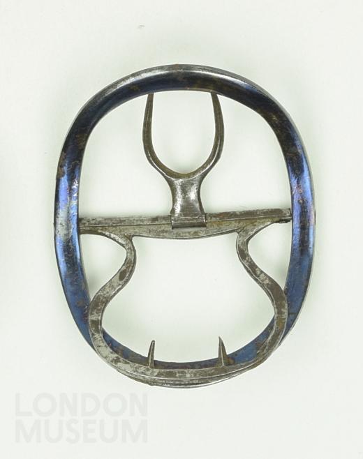 Shoe buckle (one of a pair with A13198b), probably man's. Oval blued steel ring; steel pitch-fork type. Late 1780's (?). Everyday, cheap.
