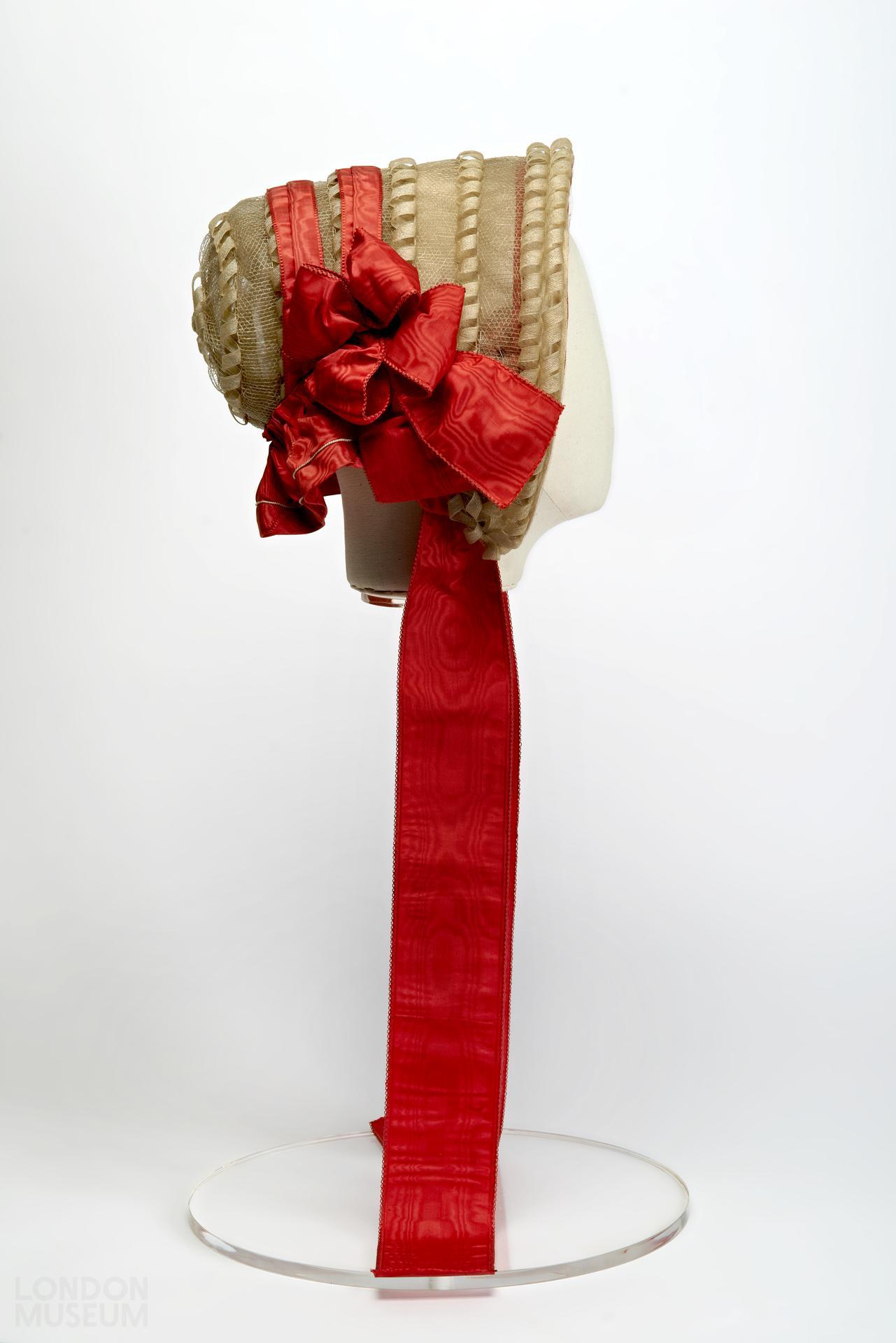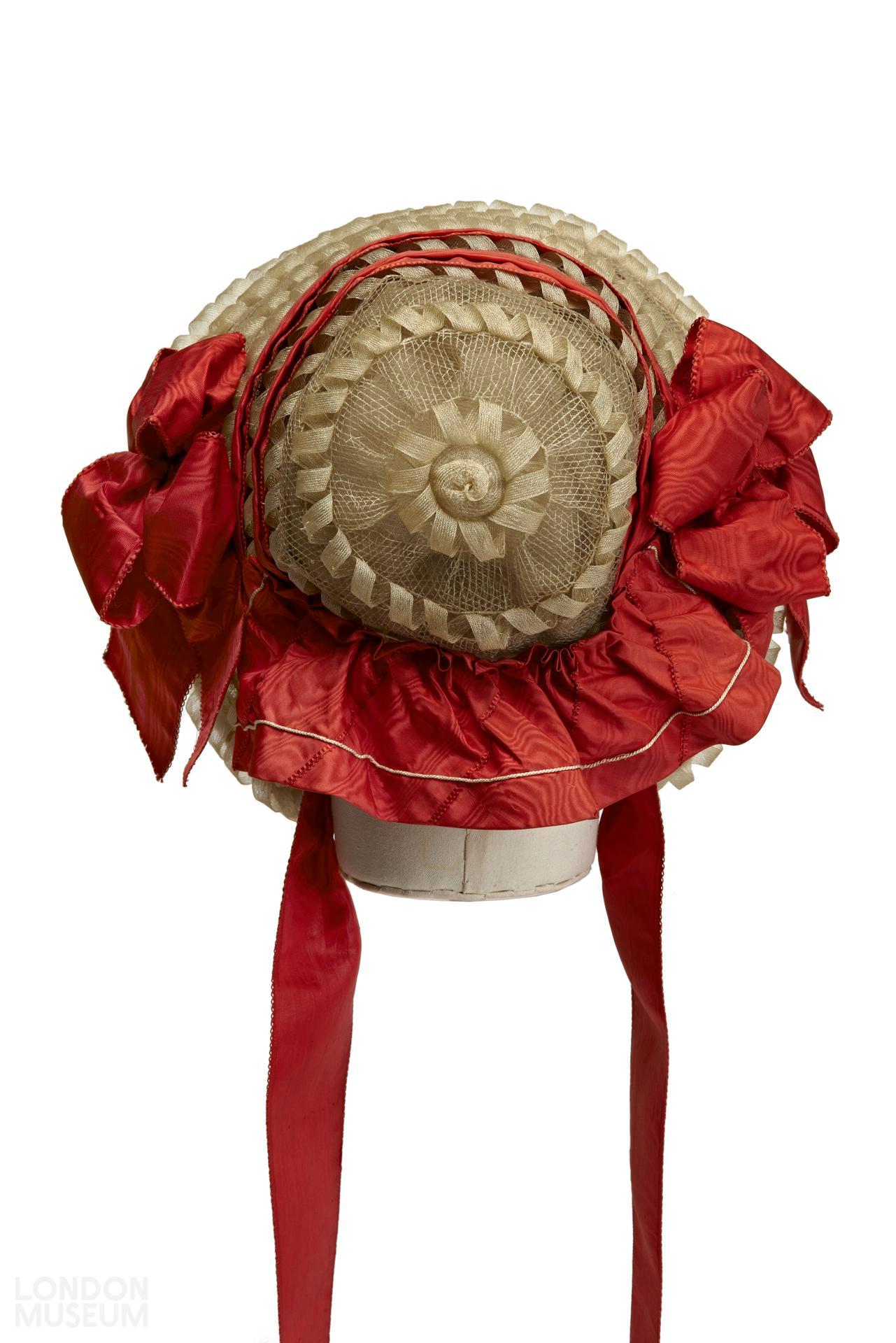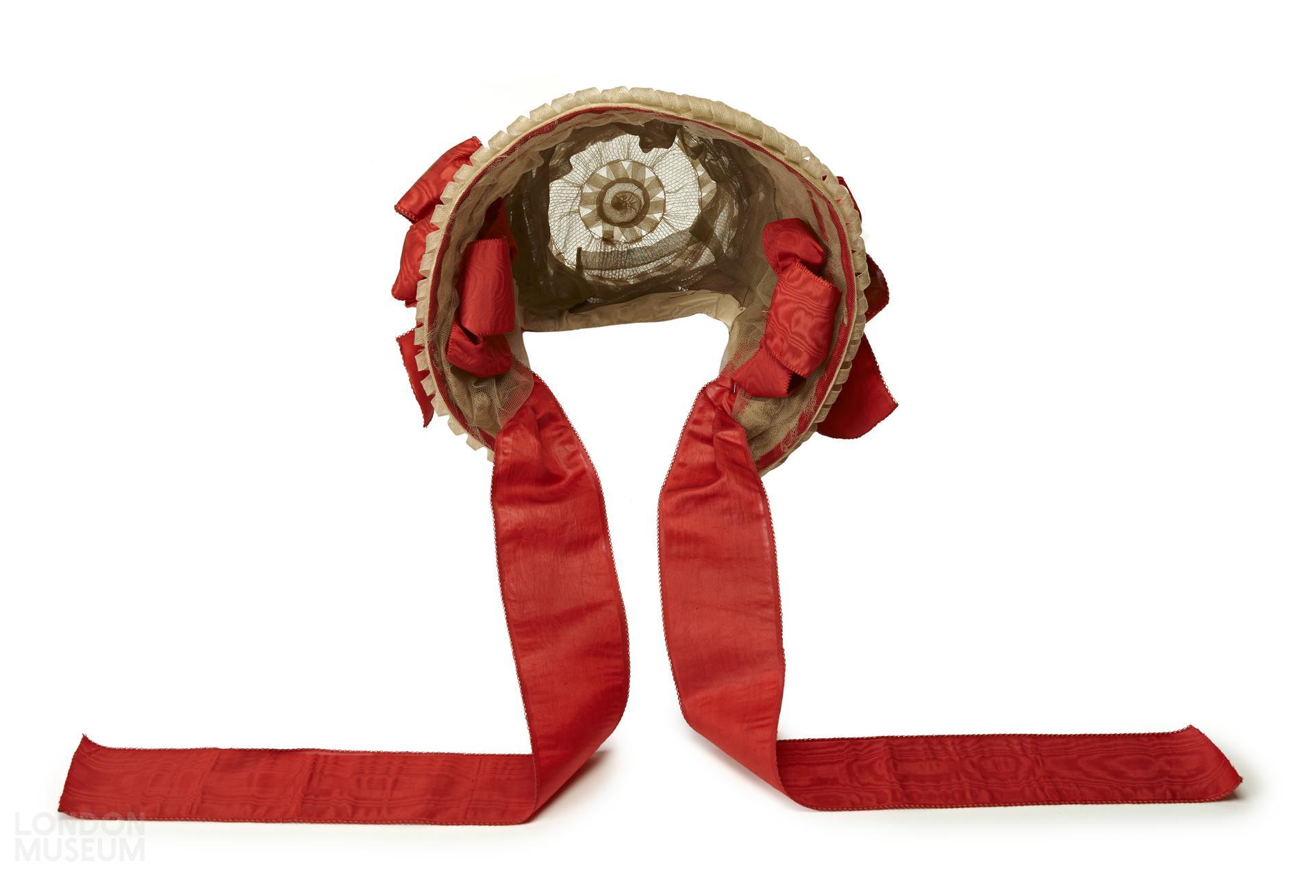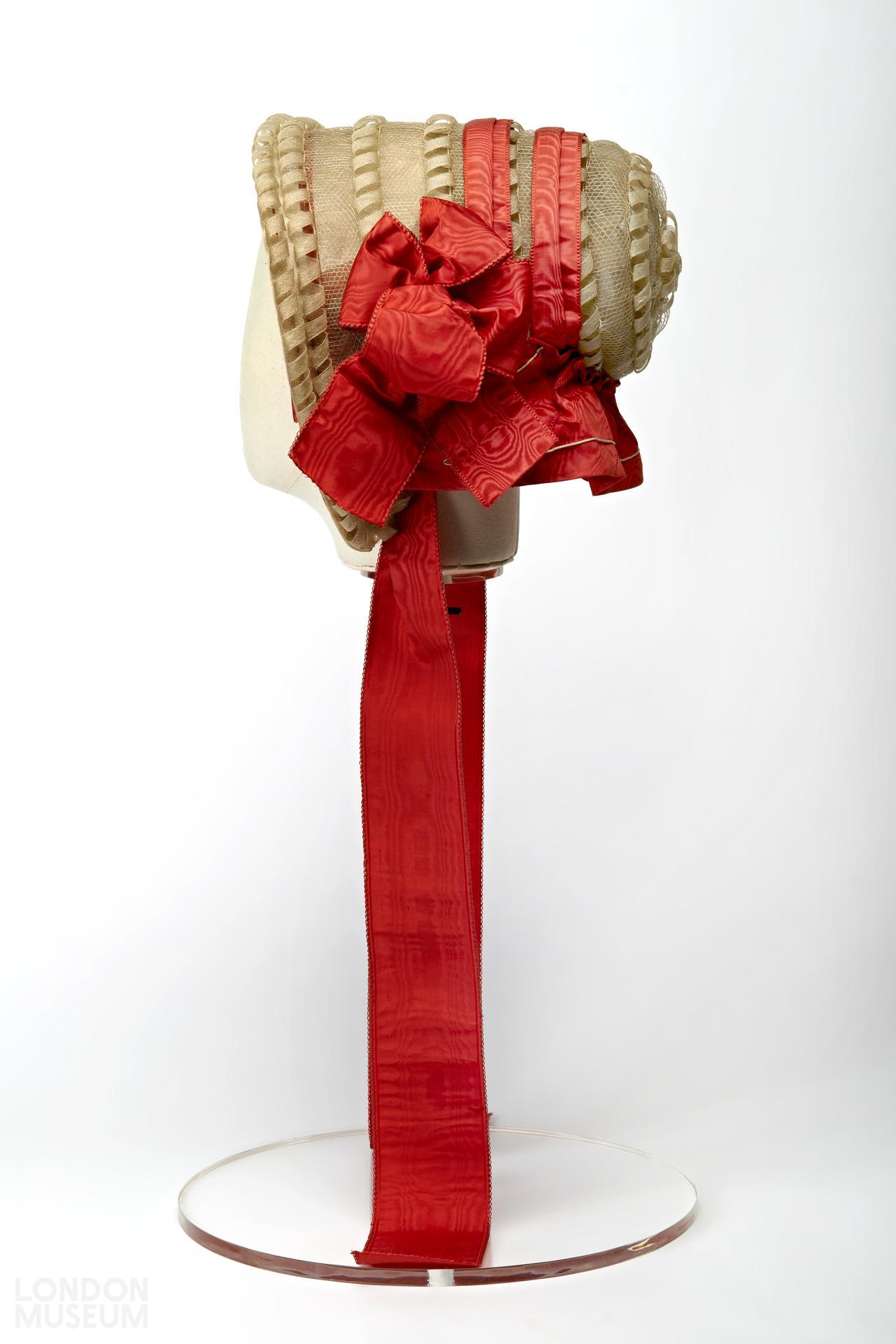 White plaited horsehair braid bonnet. Bands of braid sewn together to form bonnet straight along top from front to back; front edge wired. Raspberry pink coloured silk frill at neck edge. Bright pink watered silk ribbon and bobbin lace (Honiton) applique on net trimming. Bright pink watered silk ties. Red velvet ribon inside brim. Lined with white crepe and net. Condition: good.