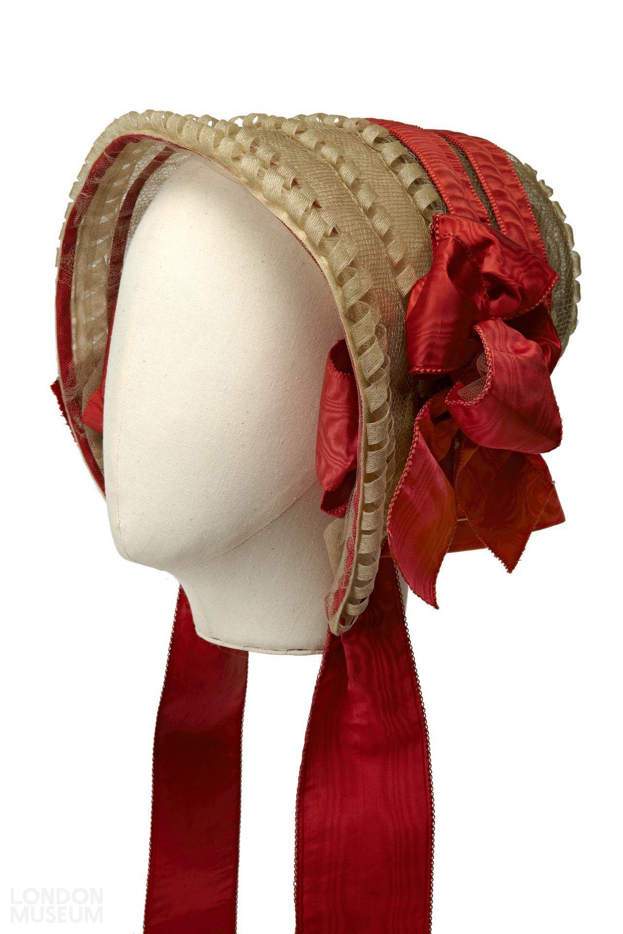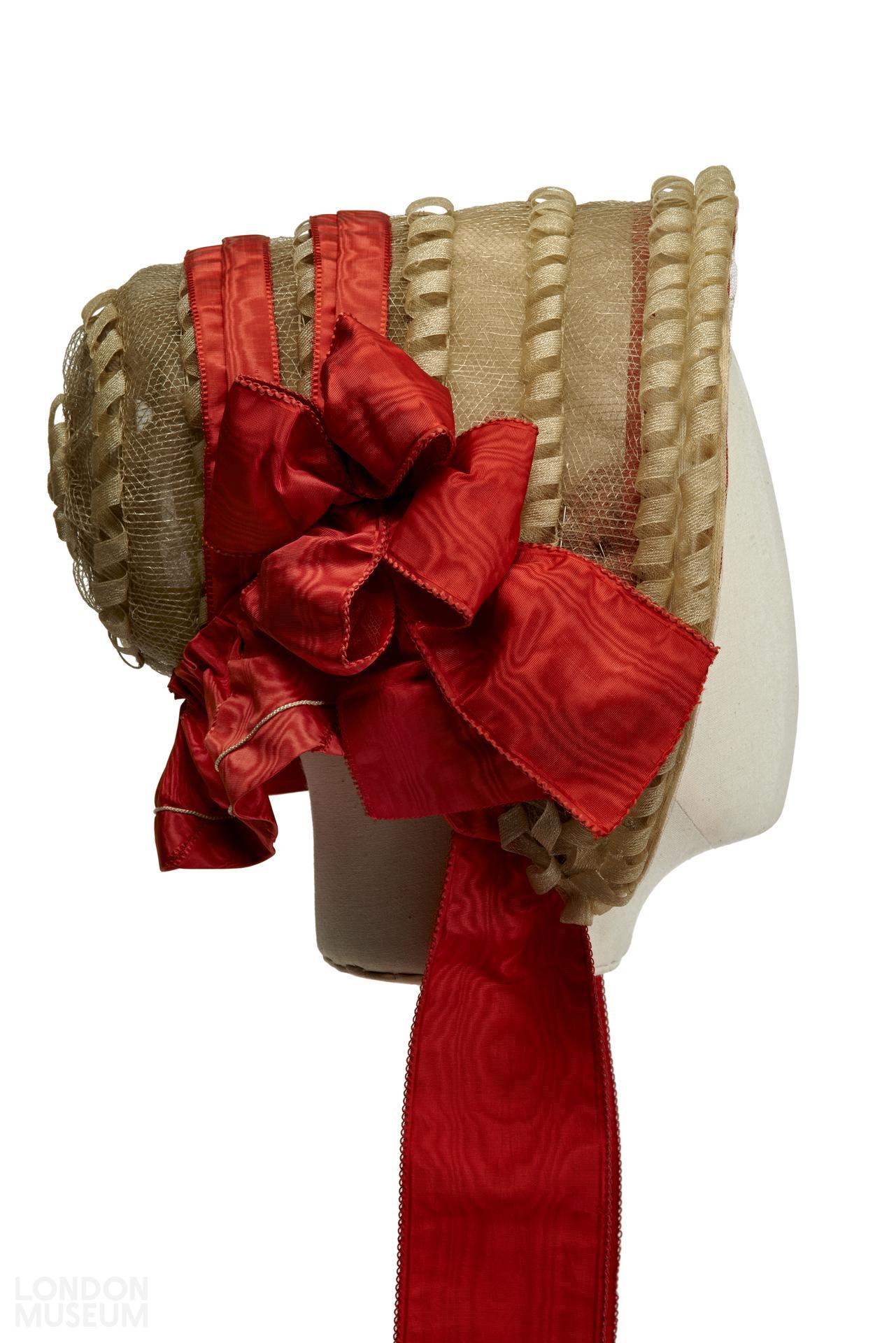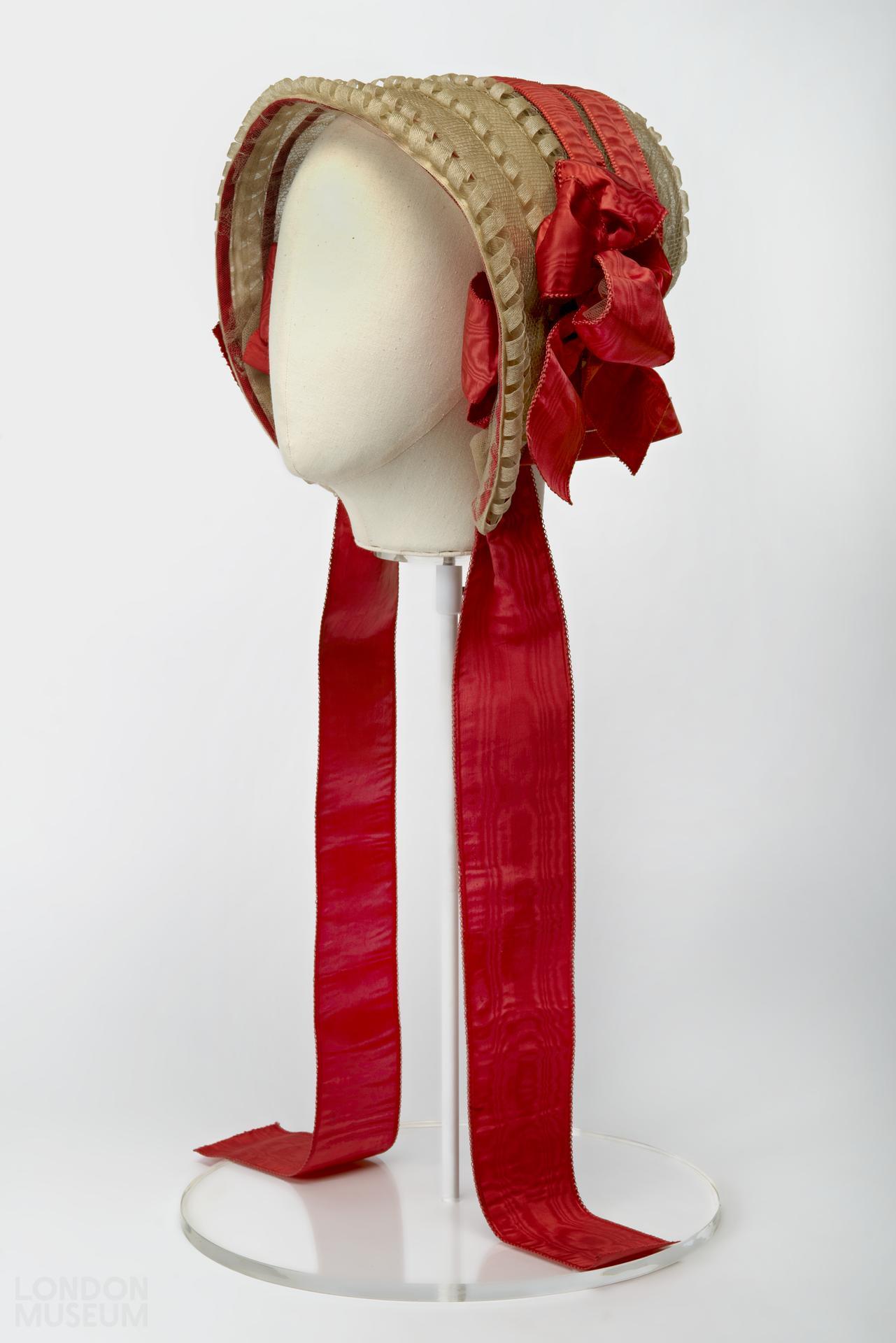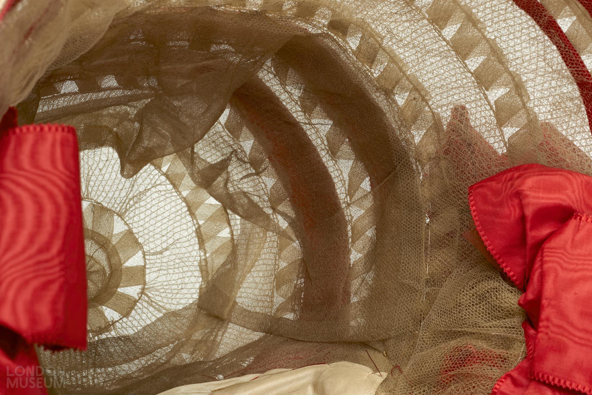 White plaited horsehair braid bonnet. Bands of braid sewn together to form bonnet straight along top from front to back; front edge wired. Raspberry pink coloured silk frill at neck edge. Bright pink watered silk ribbon and bobbin lace (Honiton) applique on net trimming. Bright pink watered silk ties. Red velvet ribon inside brim. Lined with white crepe and net. Condition: good.