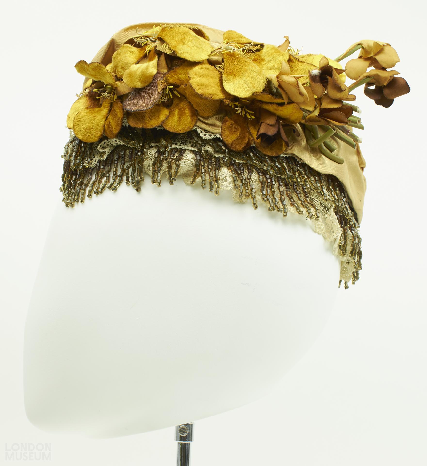 Hat with crown of pale orange (cream) corded and ruched satin. White lace ruffled trim with brown bead fringing around the edge of the hat. Trimmed on one side with orange, yellow and brown silk flowers. Lined in a white net fabric. Some beads from the hat's fringing detached and stored in an artefact bag alongside the hat.