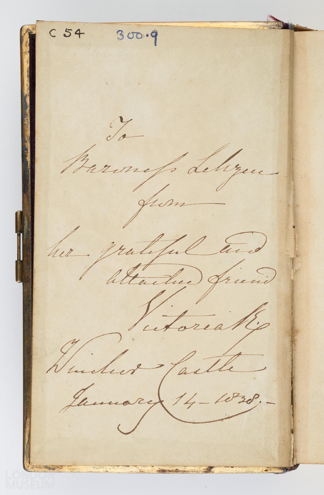 The form of morning prayer, according to the use of the united Church of England and Ireland; together with the psalms of David, to which are added the first lessons to be read on Sundays, and the second lessons as they are appointed to be said every morning in the year, arranged by the late honorable Charlotte Grimston. Sixth edition. Volume 1. A royal gift, donated by Queen Victoria to a friend, inscribed 'To Baroness Lehzen from her grateful and attached friend Victoria R. Windsor Castle, January 14 1838'.