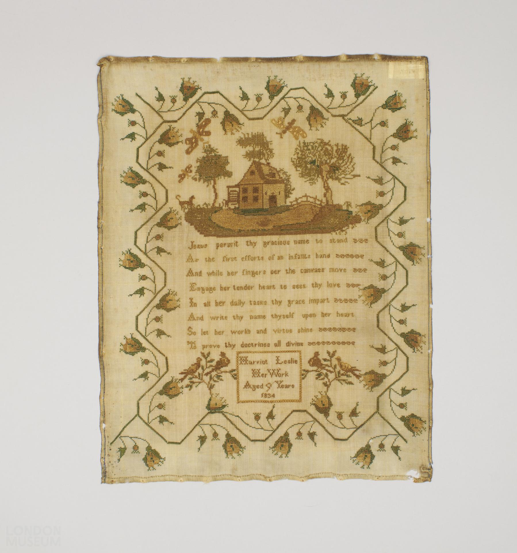 Worked by Harriot Leslie, aged 9 years. 1834.